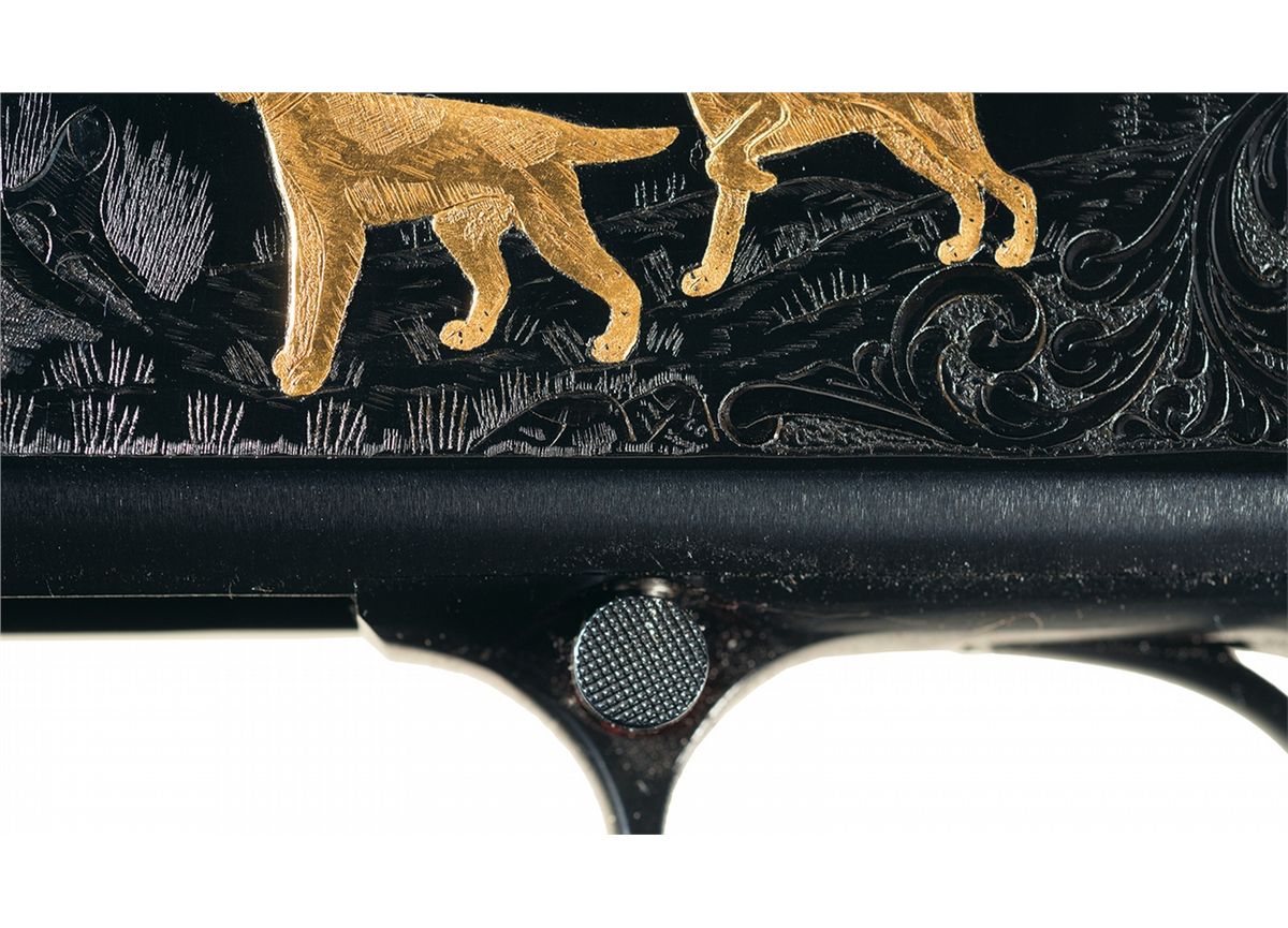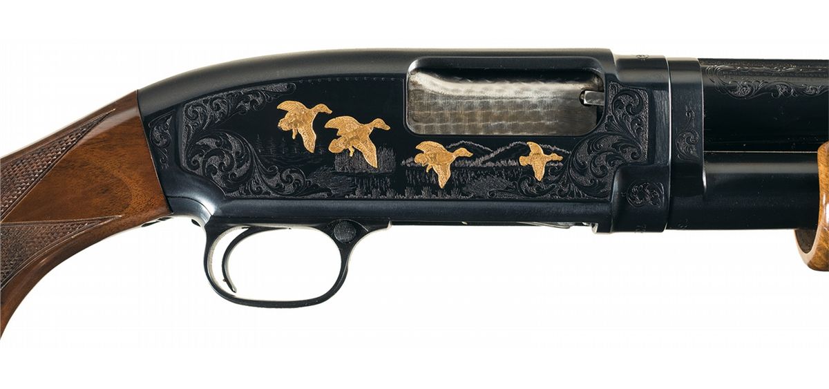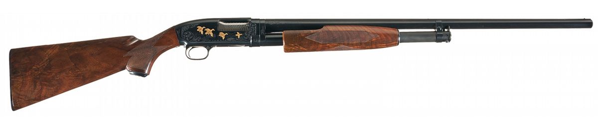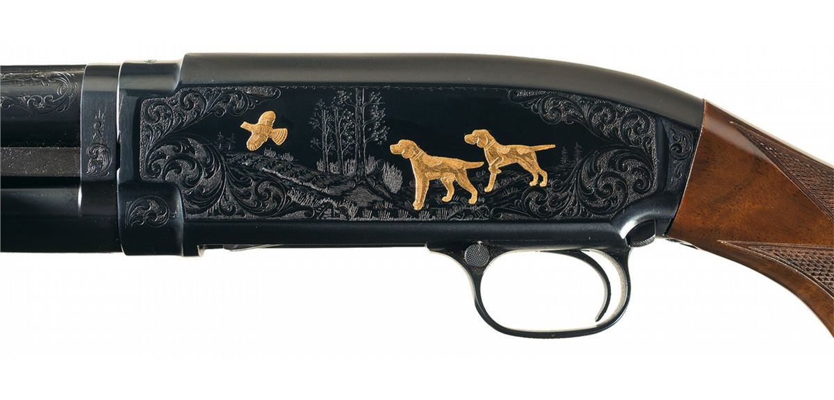 Manufactured in 1937. This example has well executed game scenes engraved on both sides of the receiver with two gold inlaid dogs pointing at a flying gold inlaid grouse in a field scene on the left side and four gold inlaid ducks on the right side over a marshy area. There is floral scroll engraving surrounding the game scenes on the sides of the receiver along with flourishes of floral scroll on the trigger guard, takedown collar, around the receiver proofmark and at the rear of the barrel. The left side of the receiver has what appears to be the initials "LC" engraved near the bottom. The bolt and shell lifter are jeweled. The takedown collar is stamped "STANDARD TRAP" which divides the serial number into two blocks of three numbers. The barrel has two nickel bead sights, is marked "FULL" with a constriction of .006 and has a 2 3/4 inch chamber. There is a "W/P" in an oval proofmark stamped to the left of the rib near the breech end of the barrel and on top of the receiver. Mounted on a nicely figured, diamond pattern checkered, extended walnut forearm and pistol grip stock with steel grip cap and checkered plastic buttplate. Length of pull is 14 1/4 inches.