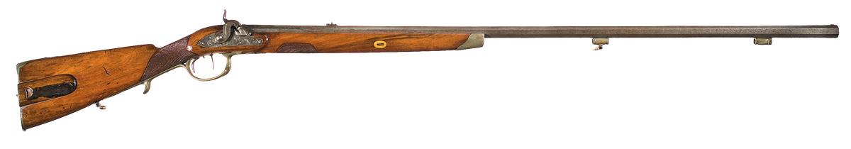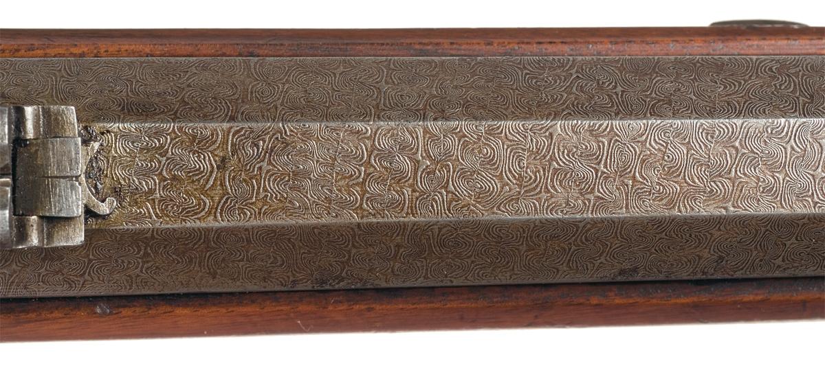 No makers marks (possibly German in origin) with a 44" Damascus barrel with silver inlaid relief chiseled floral patterns on the upper three flats at the breech and swamped muzzle ends. There is a recessed gold unrecognizable seal or proof on the top flat 3 1/2" from the breech. Crisp Damascus pattern with a blade front sight and three leaf (two folding) rear sight. The bottom of the barrel is fitted with two silver plated ramrod pipe, (ramrod absent), with a sling swivel mounted on the rear pipe. The lock and hammer are decorated with light floral engraving. Double set triggers, massive silver plated brass trigger guard and mounted with a walnut half stock with a silver forend cap, checkered area ahead of the trigger guard and wrist, cheekpiece, brass buttplate, patch box with walnut lid and a sling swivel.