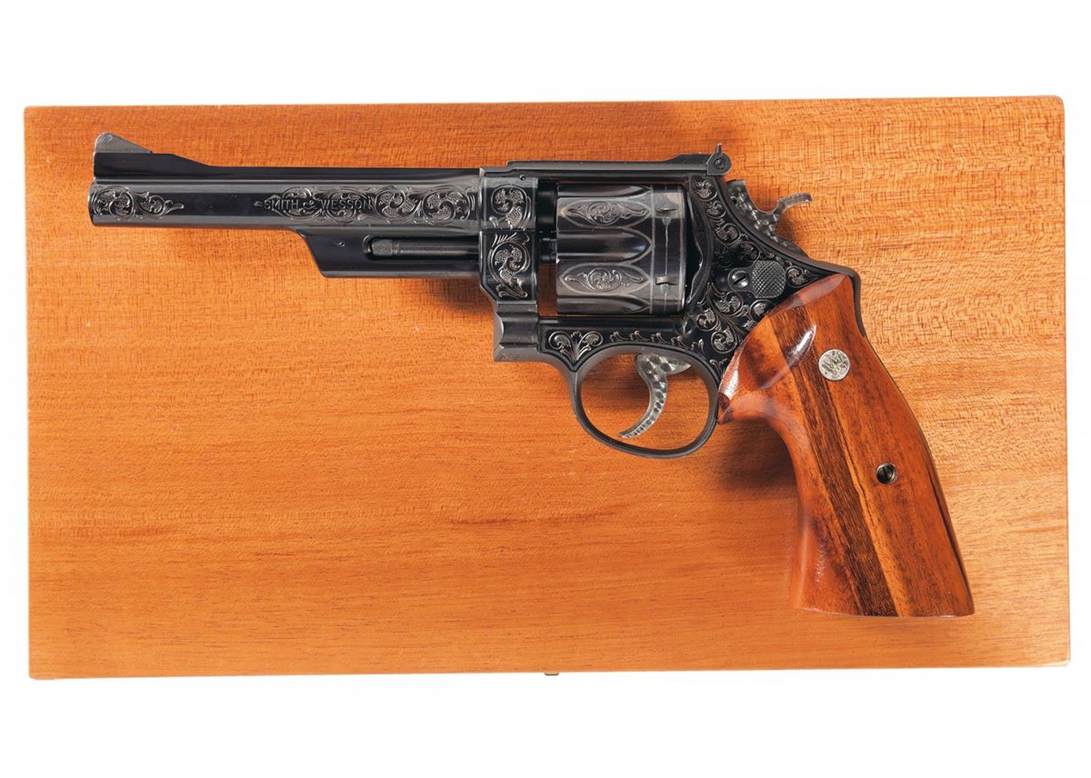 Manufactured circa 1964 and subsequently floral scroll engraved and silver inlaid. Fixed ramp front sight and adjustable rear sight. The sides of the barrel and frame have floral scroll engraving. The cylinder and trigger guard also have flourishes of floral scroll. There is a silver inlaid border around the outside and inside of the frame and cylinder with a silver inlaid coyote on the right side. The trigger and hammer sides are jeweled. Fitted with smooth hardwood grips with silver S&W medallions. With hardwood case, cleaning rod, screwdriver and shipping box.