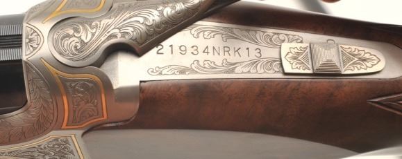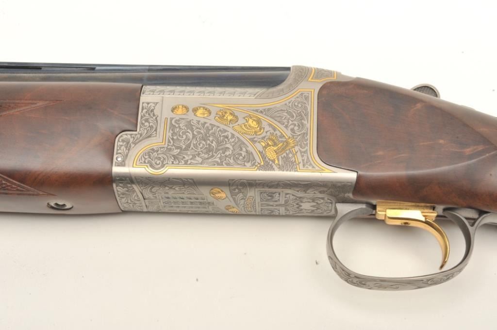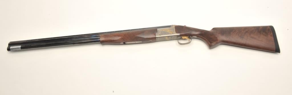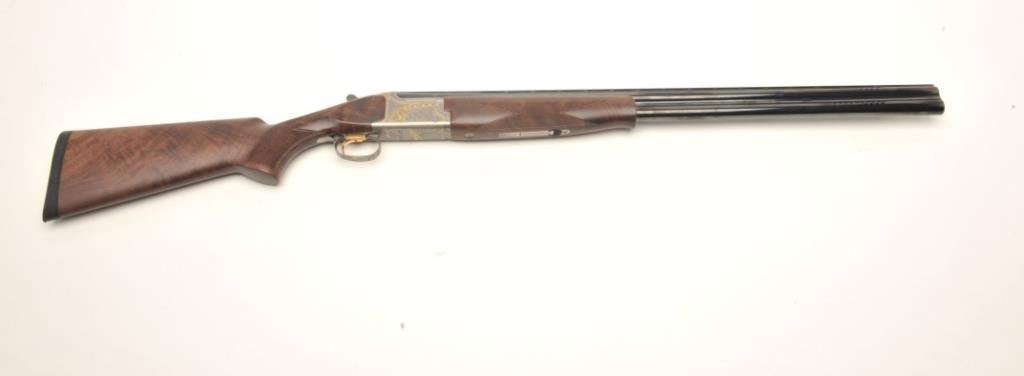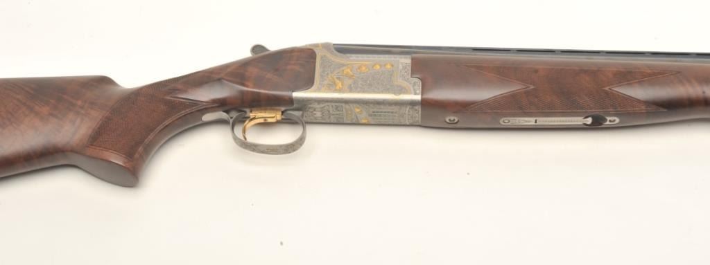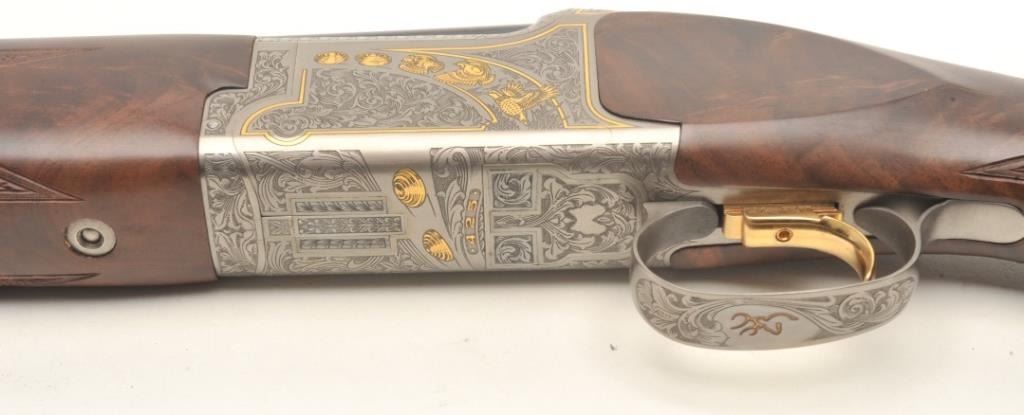 Engraved and gold accented Browning Sporting Clays (Model 425) O/U shotgun, 12 gauge, 30” ventilated rib/ported barrels, blued finish to barrels, single gold trigger, deluxe checkered finely grained wood stocks, autoejectors, S/N 21934NRK13, in factory cardboard box with 2 extra gold finished triggers, Plus invector chokes (upper & lower) with an extra Imp. Cyl. choke, choke removal tool and instructions booklet. Thisshotgun is in overall like new condition showing little handling. (Modern). Est.: $900-$1,800.