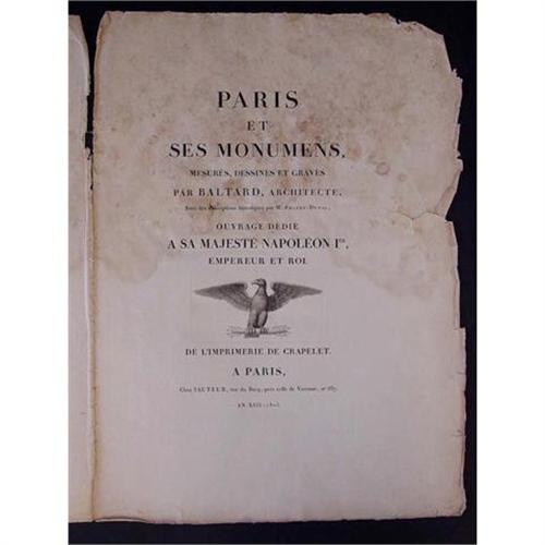 Engravings of Paris monuments dedicated to Napoleon the First and published in 1805. There are 70 pages in total, about 20 of text, and the rest of engravings. Some of the engravings bear a Louvre Museum round water seal that reads: "Calcographie Musees Nationaux du Louvre." The introductory page reads as follows: "PARIS ET SES MONUMENS, MESURES, DESSINES ET GRAVES PAR BALTARD, ARCHITECT. AVEC DES DESCRIPTIONS HISTORIQUES PAR M. AMAURY-DUVAL; OUVRAGE DEDIE A SA MAJESTE NAPOLEON 1ER. EMPEREUR ET ROI." Condition as shown. Please ask questions, request additional photos and shipping costs prior to bidding.