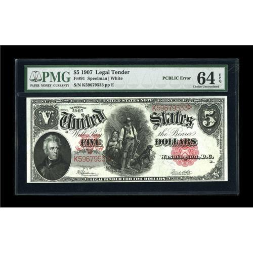 <B>Engraving Error Fr. 91 $5 1907 Legal Tender PMG Choice Uncirculated 64 EPQ.</B></I> This Woodchopper carries the engraving error where "PUBLIC" is engraved "PCBLIC" on line six of the obligation clause that is posted on the back. The error is best seen with a magnifying glass. This error has been known for many years within the hobby. This is the nicest one of these we have seen in quite a while.<BR><BR><b>Shipping:</b> Coins & Currency (<a target="_blank" href="http://www.heritageauctions.com/common/shipping.php">view shipping information</a>)