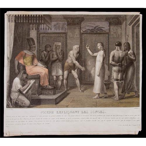 Extraordinary colored engraving by Deveria and Henri of a Biblical subject entitled Joseph expliquant les songes (Jesus explains the dreams). The text below the image reads as follows: Deveria inv. et Henri Sc. Joseph expliquant les songes. Pharaon avait eu deux songes qui l´effrayaient et dont personne ne pouvait penetrer le sens. Son grand echanson se ressouvint alors de la prediction que Joseph lui avait faite lorsqu´il etait en prison avec lui el il en fit part au Roi. pharaon fit venir Joseph, lui raconta ses songes et lui dedemanda ce qu´ils presageaient. Grand price, lui repondit celui-ci, le Gel vous anonce para la sept annes d´abondance, qui seront suivies de sept annes de sterilite. Pour preveneir les maux de cette affreuse disette, il faut qu´un homme sage et prudent recueille avec soin le superflu des moissons afin de menager a vos sujets de precieuses ressources, lorsque la terre sera frappe de sterilite. Depose. A Paris ces Bulla Rue St. Jacques No. 38. One of a series of three listed separately. Minor losses on corners and overall minor signs of wear as shown. Please ask questions, request additional photos and shipping costs before buying. Measurements: Sheet: 11" by 9.8"; Image: 10.6" by 7.5" approximately.