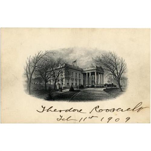 <B>Engraving of the White House Signed by Theodore Roosevelt as President,</B></I> 6.25" x 4", adding the date, "<I>Feb 11th 1909</B></I>" in his hand. Some evidence of soiling, but signature is quite large and bold and very suitable for display. <I>From the collection of Henry E. Luhrs.</B></I><BR><BR><b>Shipping:</b> Flat Material, Small (<a target="_blank" href="http://www.heritageauctions.com/common/shipping.php">view shipping information</a>)