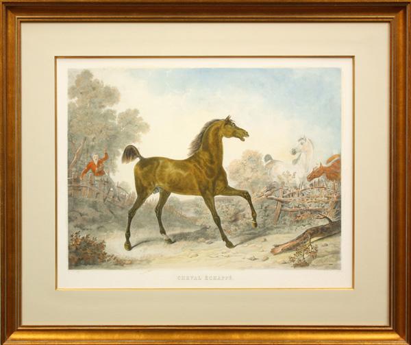 Framed color aquatint engraving, ''Cheval Echappe,'' after Carle Vernet (French, 1758-1835), signed in the plate lower right, sight: 20.375''h x 28.75''w, overall: 35.625''h x 43''w