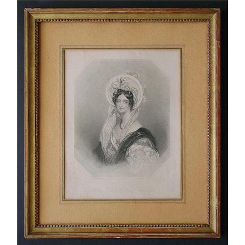 Portrait of Anne Frances, Countess of Falmouth engraved by William Henry Egleton, drawn by Alfred Edward Chalon, and printed by Mc. Queen. H. Egleton is listed in Benezit and described as a 19th Century English School engraver that, among other works, engraved the plates for the book "Portraits de l'Aristocracie Femenine," by Finden. Another copy of this engraving, with the same 1838 publication date, printer, and texts, is part of the collection of the New York Public Library. The Countess of Falmouth, born Anne Frances Bankes (1789-1864) was married to Edward Boscawen, 1st Earl of Falmouth. According to a seal on the reverse of the frame, this engraving was certified in 1951 to be an original. The following text is printed on lower border of the engraving: LONDON, PUBLISHED 1838, BY THE PROPRIETORS No. 18 & 19 SOUTHHAMPTON PLACE, EUSTON SQUARE RD.