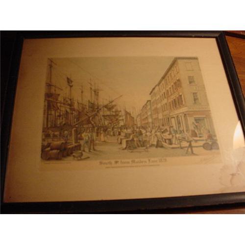 This is an aquatint engraving by R. Varin, 1929, entitled: "South St. from Maiden Lane 1828". It is in a black frame common to the times. The glass and the picture itself is in good condition. The lower righthand corner of the mat is stained.