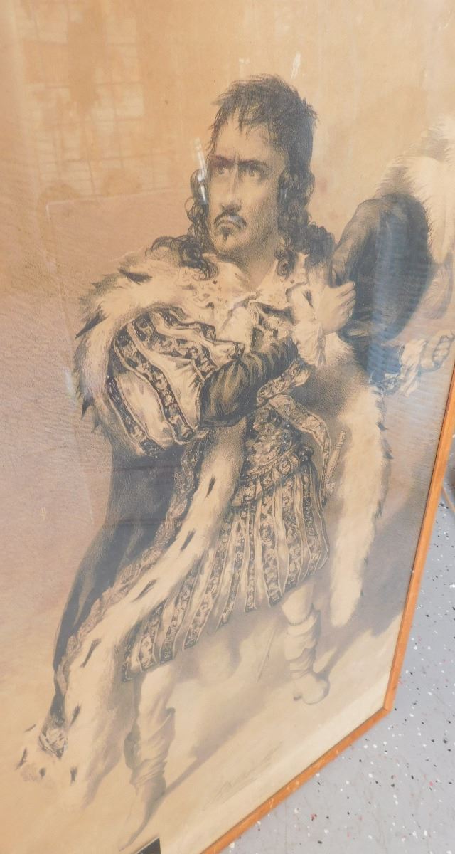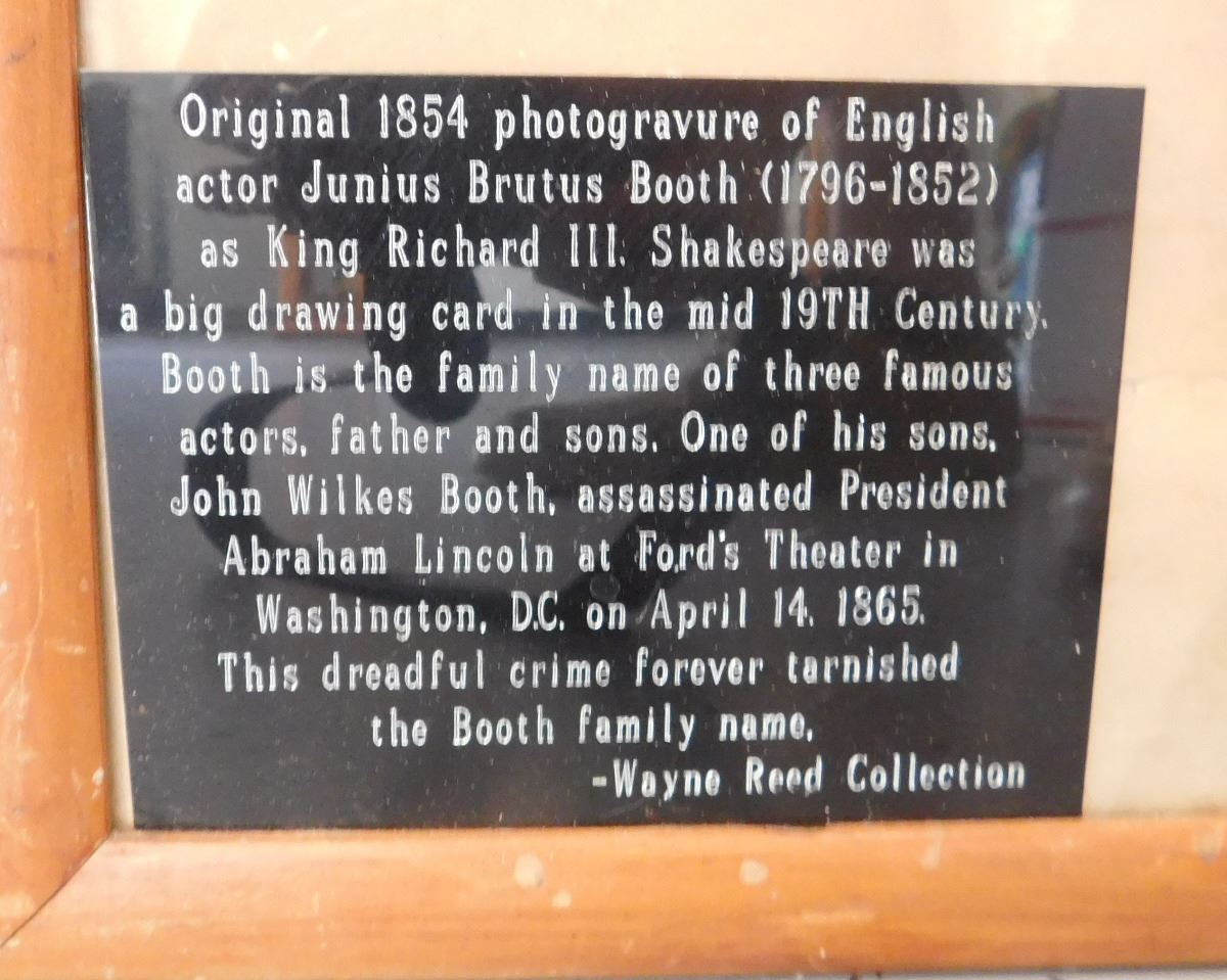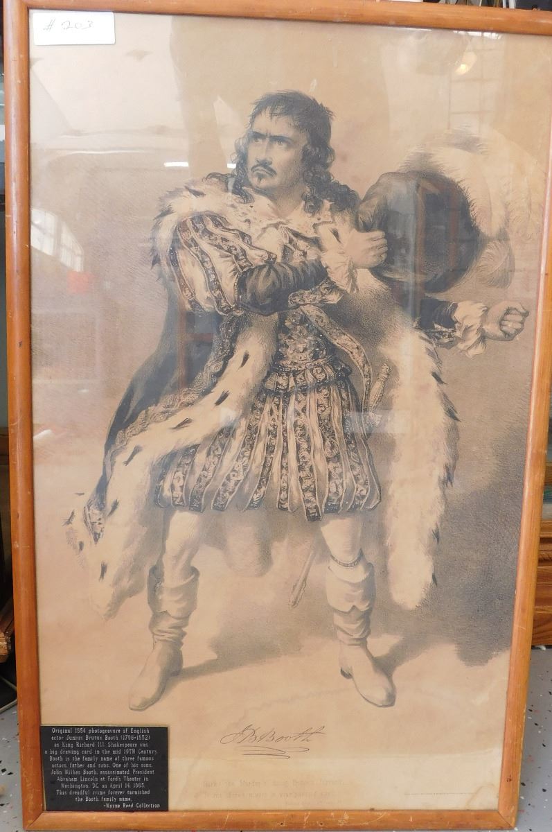 Engraving of Junius Booth, 1854. Made of wood, paper and glass, the item measures 17" x 12". Pre-Civil War period. Junius Booth was the father of John Wilkes Booth, the man who assassinated President Lincoln. Condition: Good, minor water damage, see images. Shipping: $50.00, double-boxed, may not be able to insure as item contains glass.