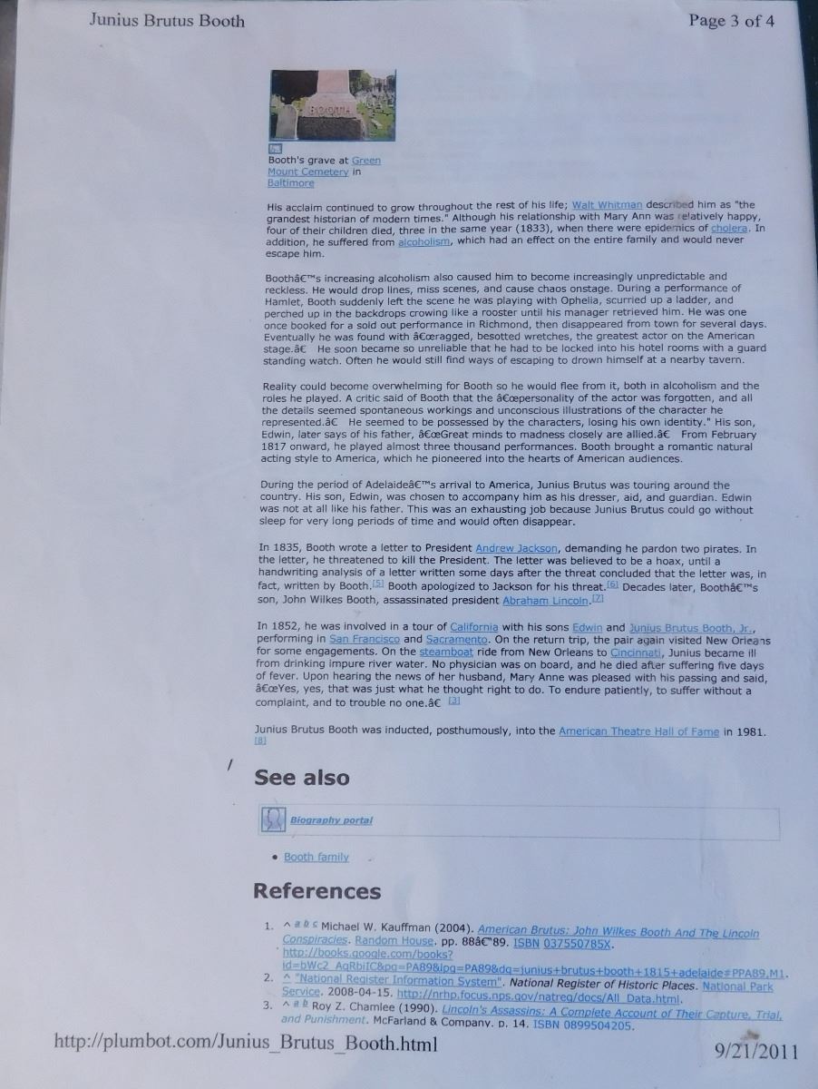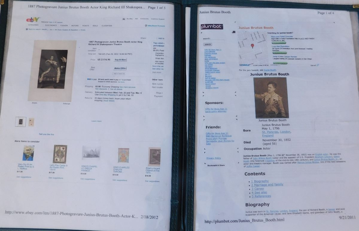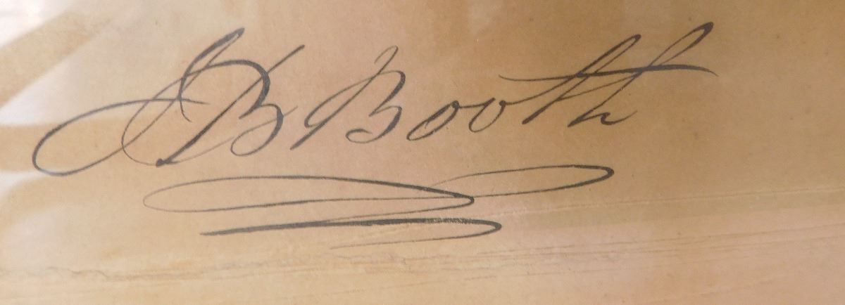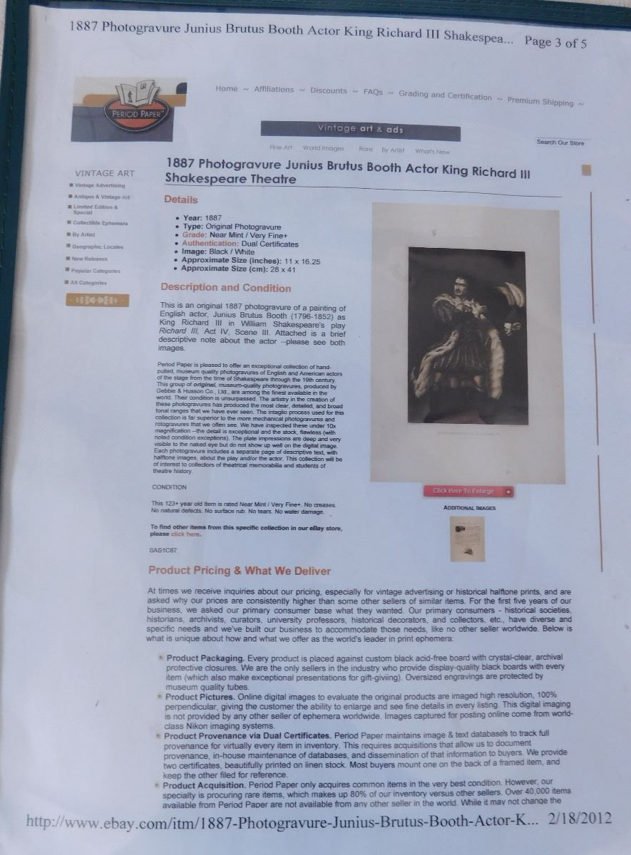 Engraving of Junius Booth, 1854. Made of wood, paper and glass, the item measures 17" x 12". Pre-Civil War period. Junius Booth was the father of John Wilkes Booth, the man who assassinated President Lincoln. Condition: Good, minor water damage, see images. Shipping: $50.00, double-boxed, may not be able to insure as item contains glass.