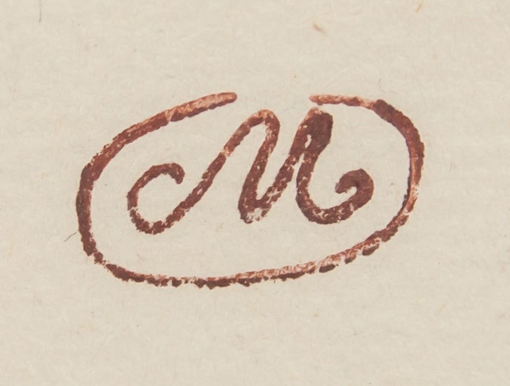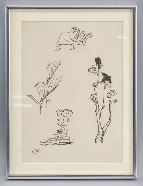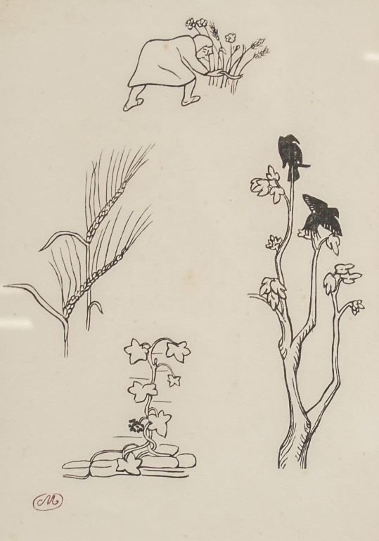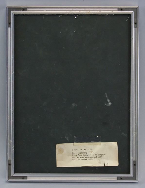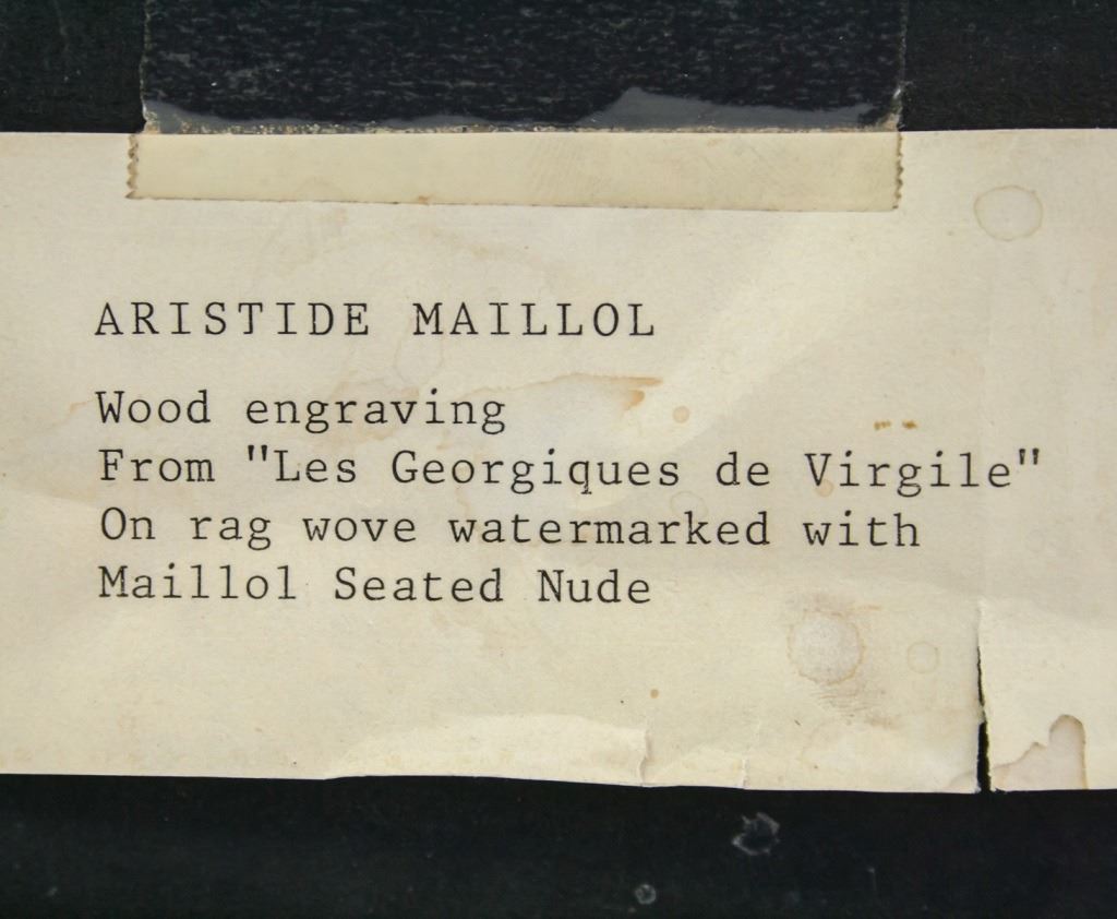 Engraving on paper, framed. Featuring four line drawings of flowers and trees. Signed "M" in a circle to the bottom left corner. Label on verso reads "ARISTIDE MAILLLOL / Wood engraving / From "Les Georgiques de Virgile" / On rag wove watermarked with Maillol Seated Nude". 28 x 20 cm (11 x 8 inches). Frame size: 35 x 26 cm (13.7 x 10.3 inches).