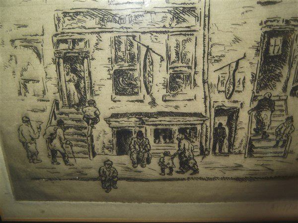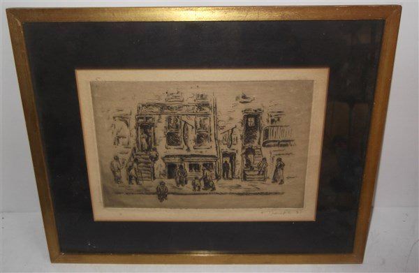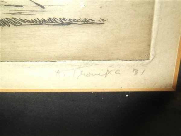 Engraving city street/building scene signed A. Tronika? '31. Framed measures 14 1/2 inches x 11 1/2 inches; Image measures 9 inches x 5 3/4 inches.