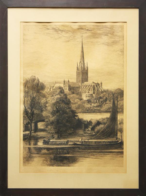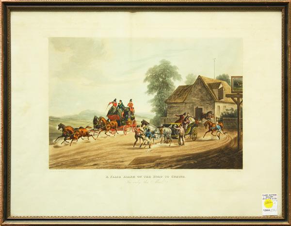(Lot of 2) Framed engravings, Cathedral near River, by Francis S. Walker (Irish, 1848-1916), pencil signed ''Francis S. Walker'' lower left, bears blindstamp lower left, and a framed colored engraving, ''A False Alarm,'' by Newhouse and Reeves, published by Moss and Lemon, largest overall: 36.5''h x 27.5''w