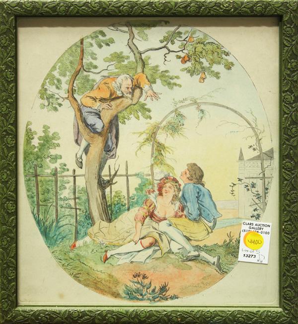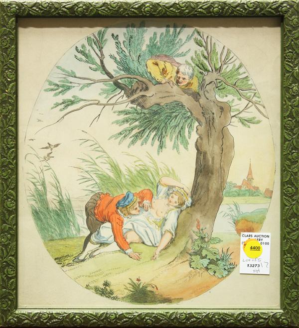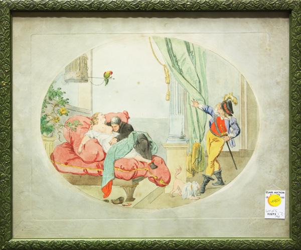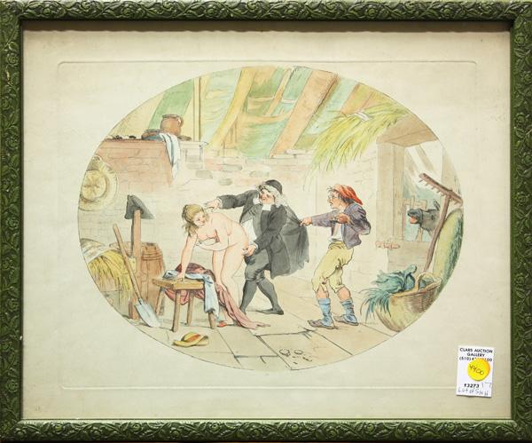 (Lot of 4) Framed color engravings, Erotic Scenes, after Johann Heinrich Ramberg (German, 1763-1840) signed ''J.H. Ramberg'' within the plate, largest overall: 16.75''h x 10''w