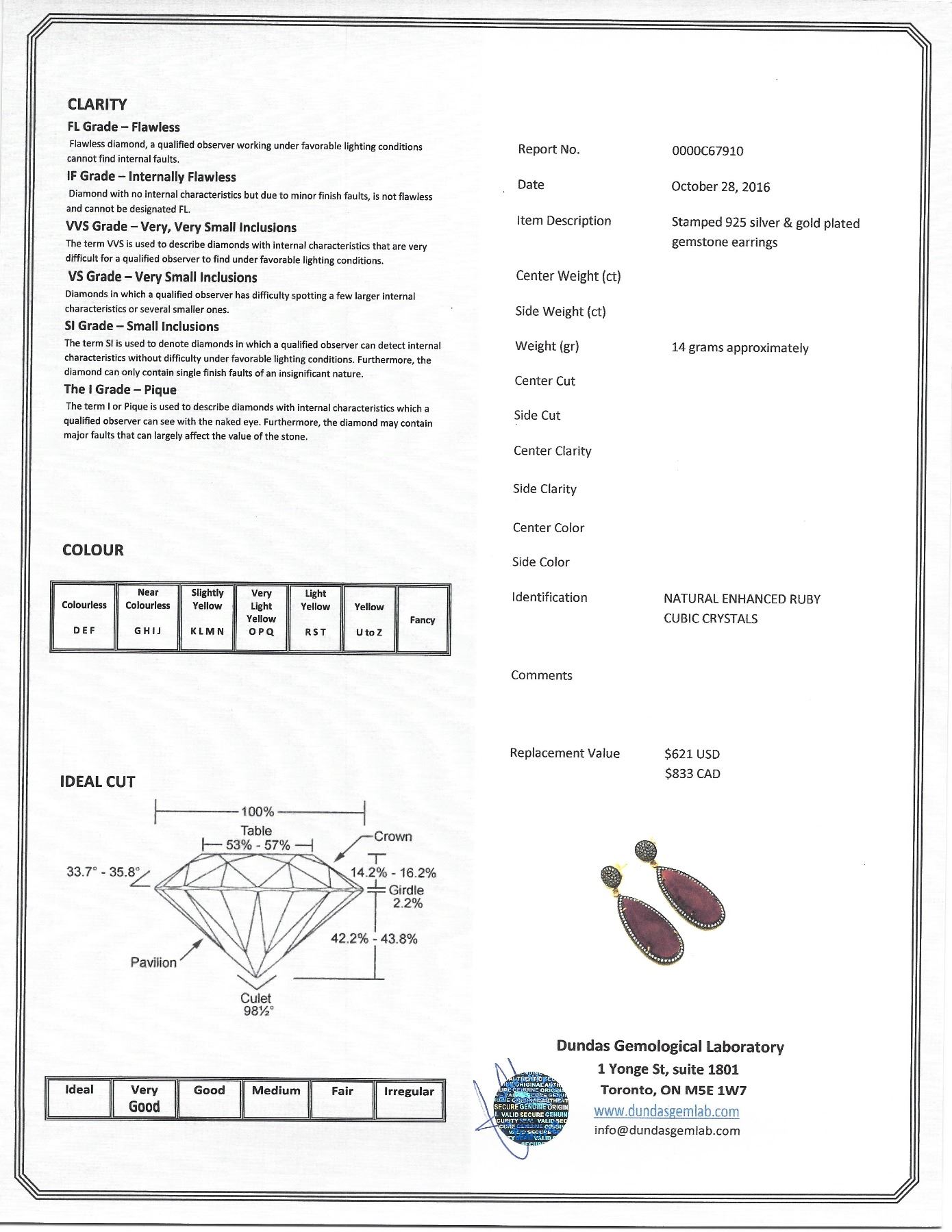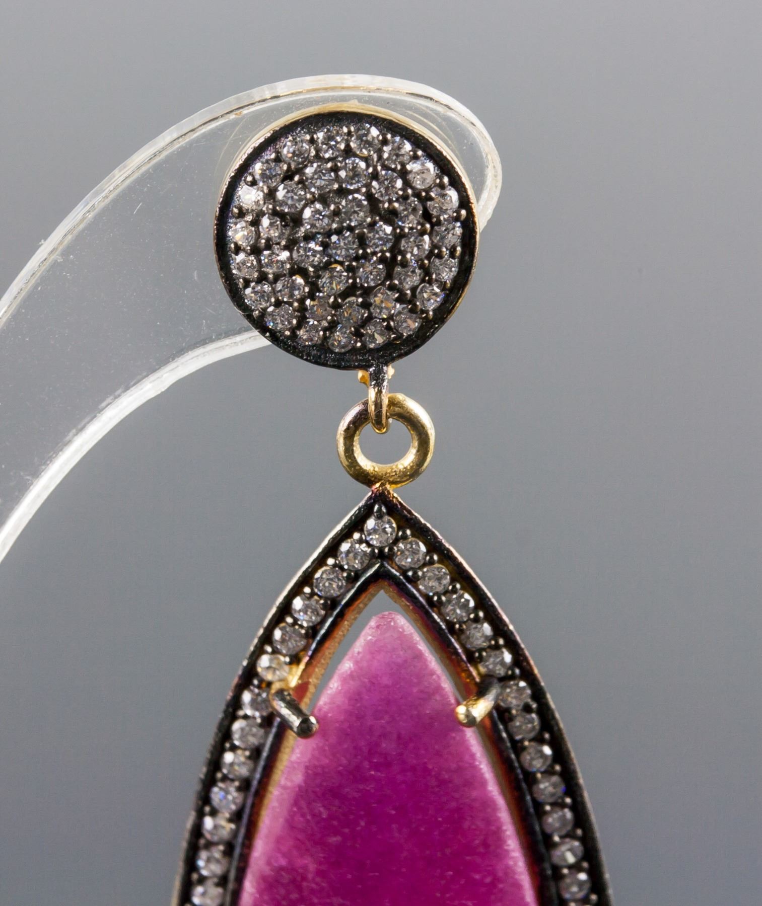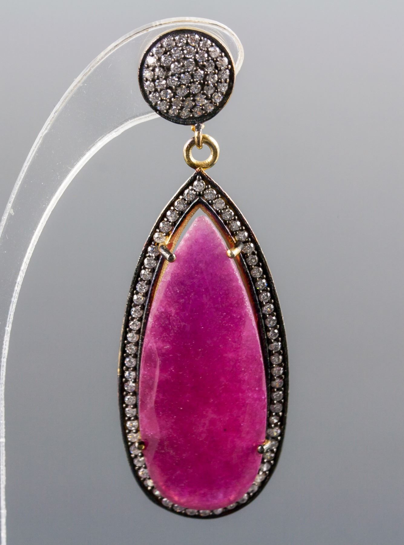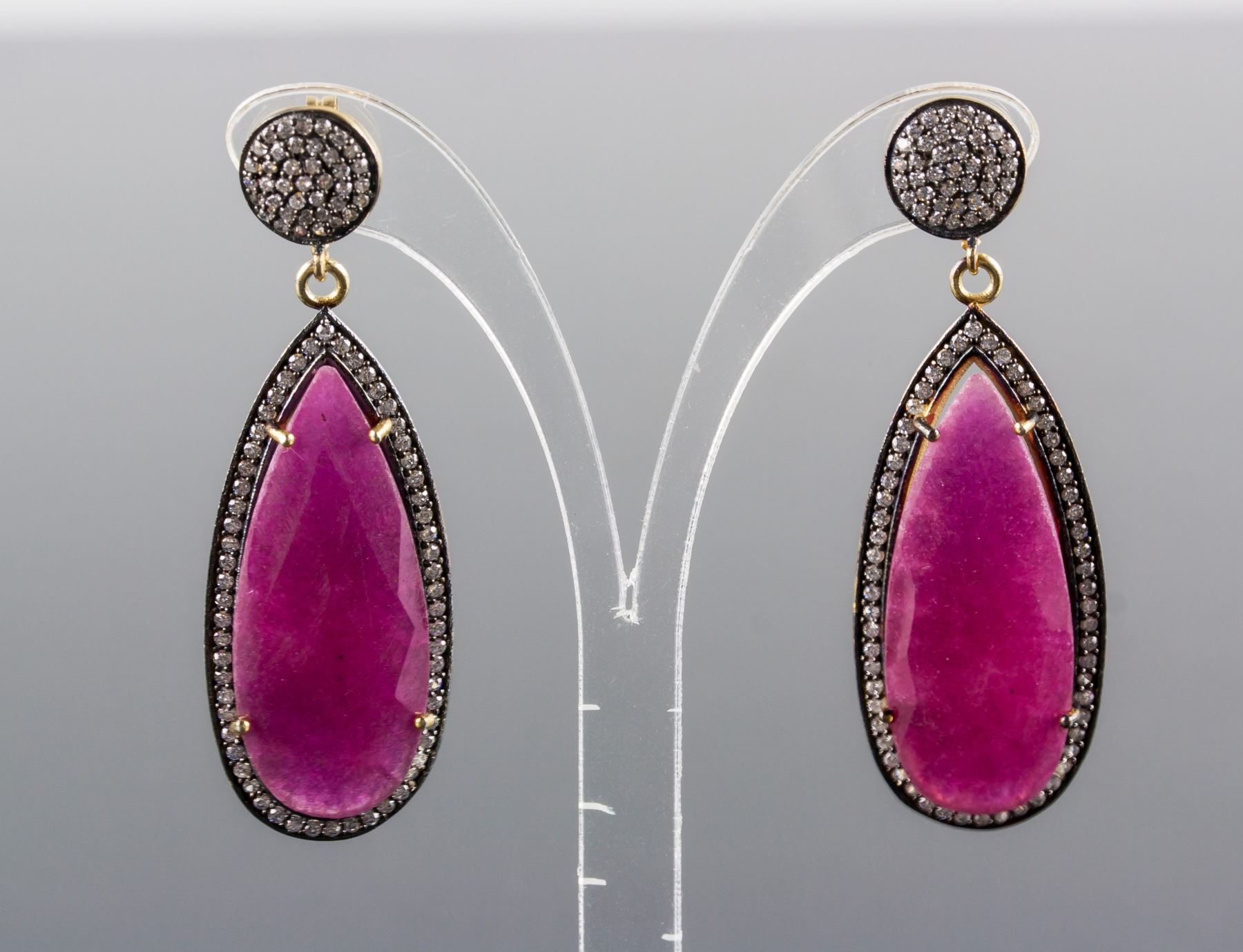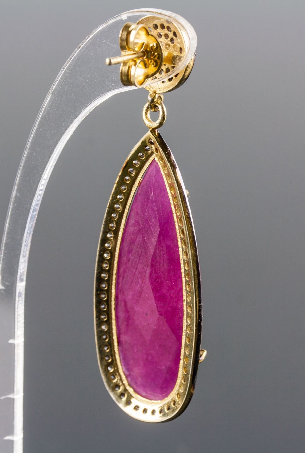 Stamped 925 silver and gold plated earrings; set with 14 grams natural enhanced ruby and cubic crystals; certified replacement value $833; 14 grams