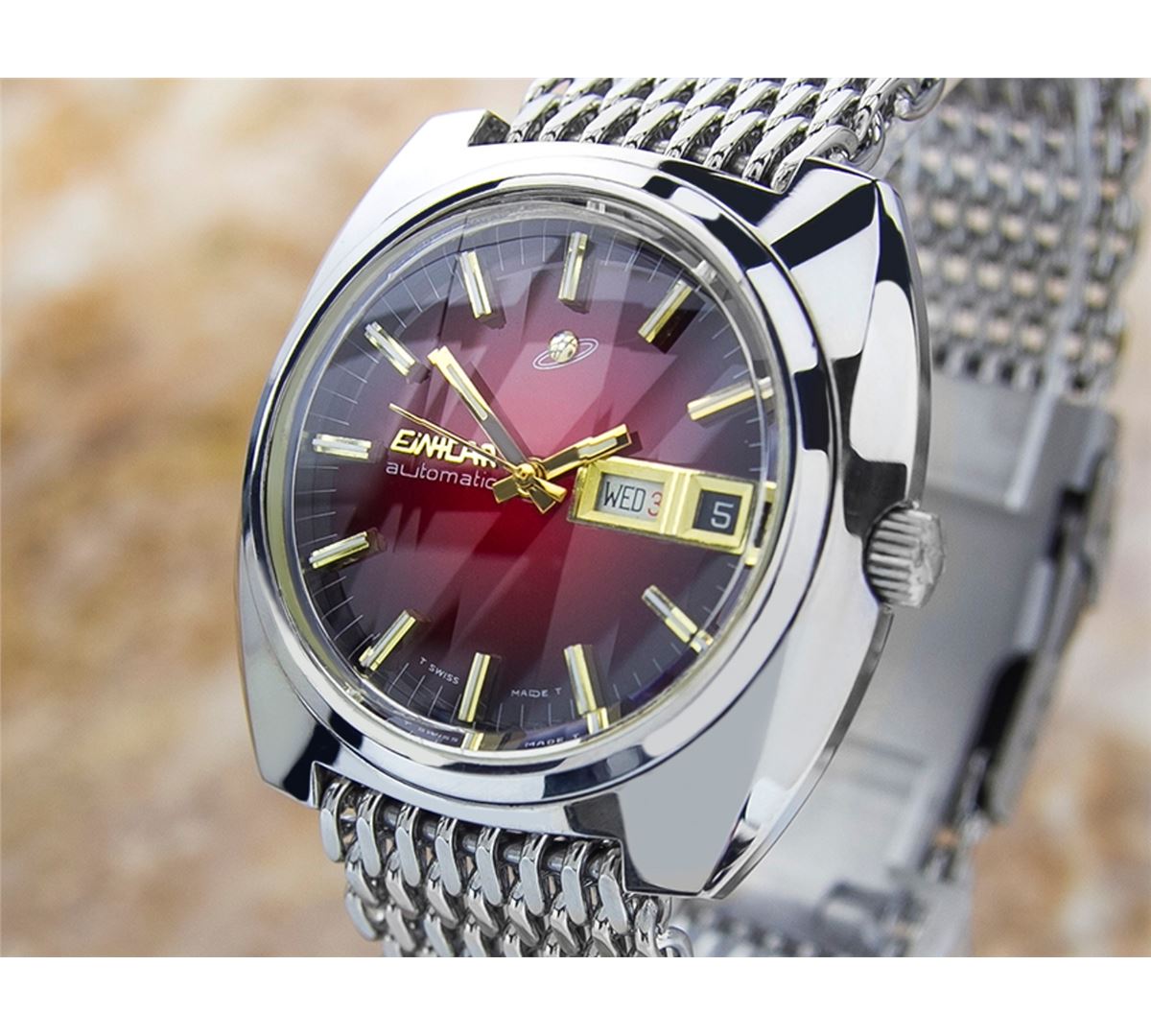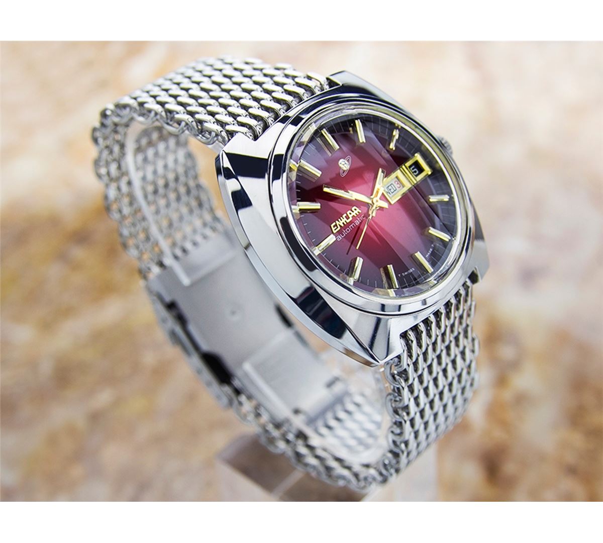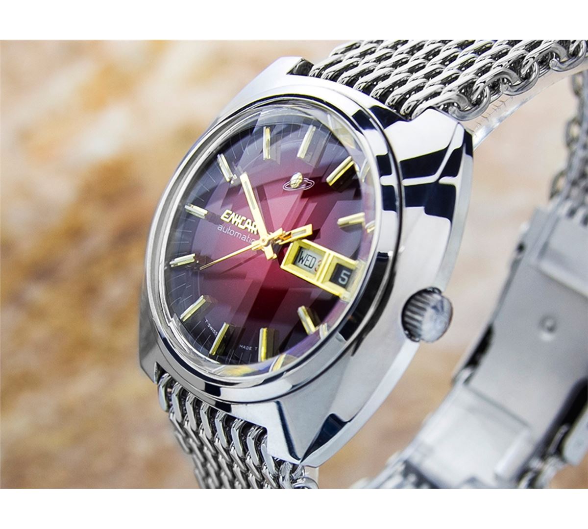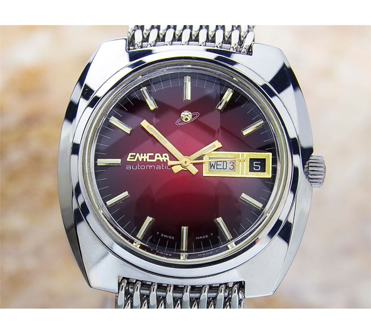 Enicar Day Date Stainless Steel Automatic Watch. Brand: ENICAR. Model: 167-07-115. Movement: Automatic. Case Material: Stainless Steel. Crystal: MINERAL GLASS. Case Size: 40x40. Band: Stainless Steel BRACELET.