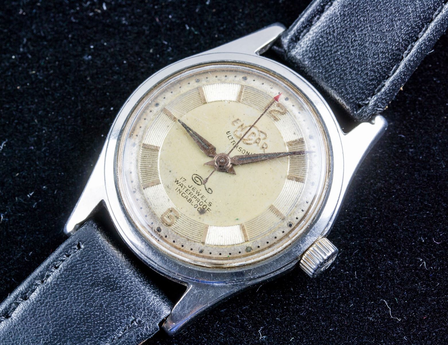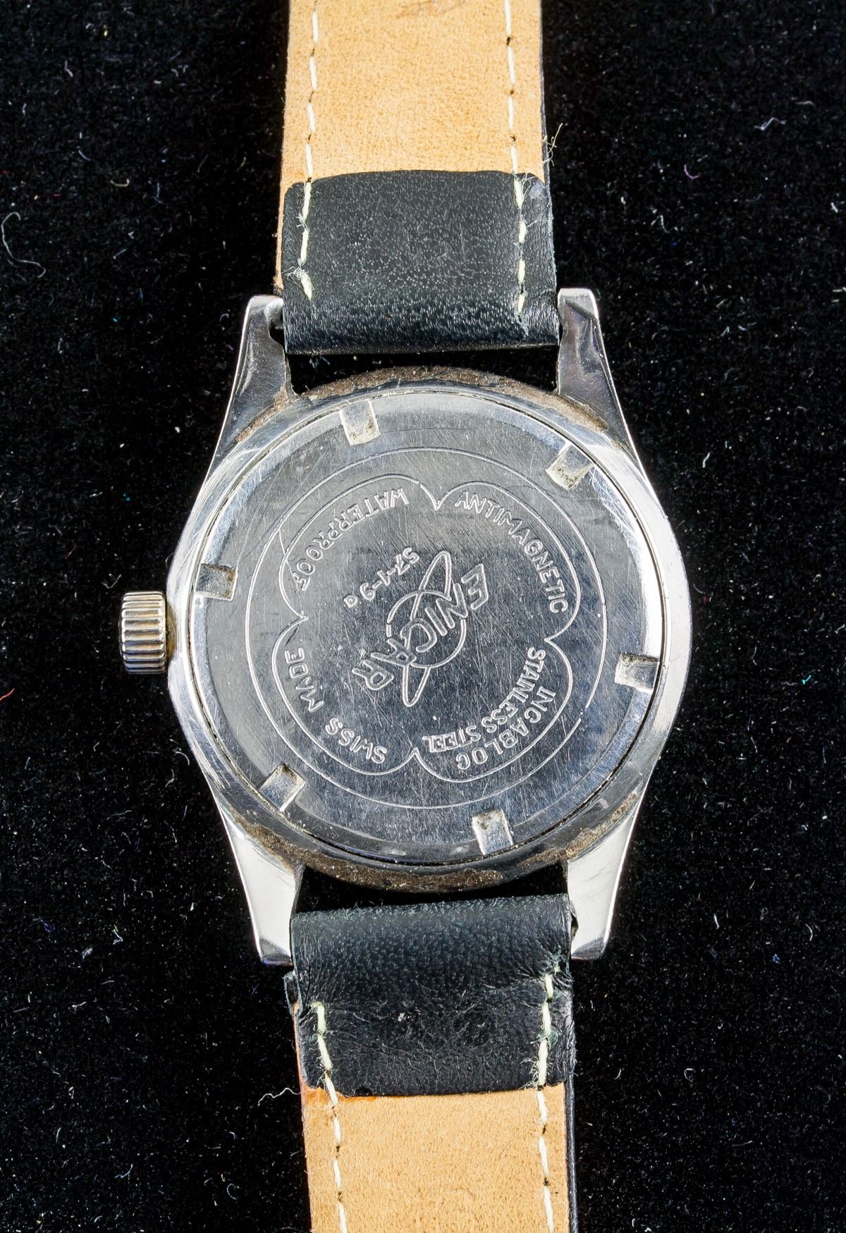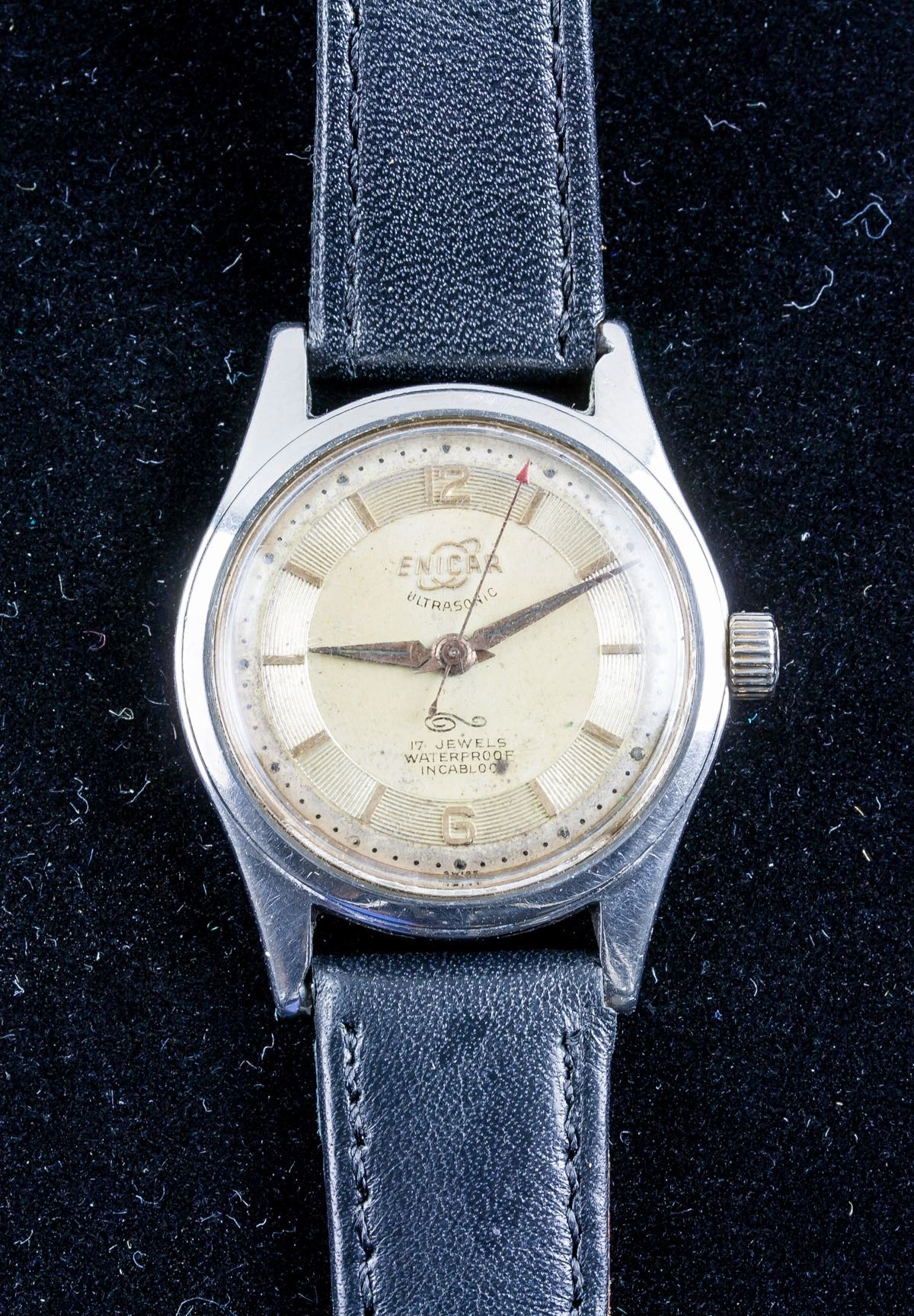 Enicar ultrasonic 17 Jewels waterproof, antimagnetic, stainless steel back, swiss made watch. Genuine leather band. Working condition. 29 grams, 23.5 x 3.5 cm