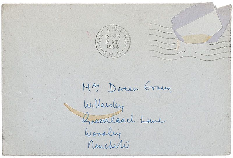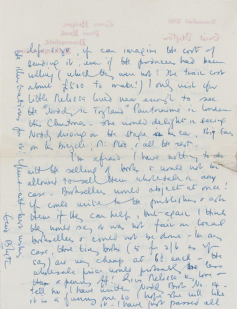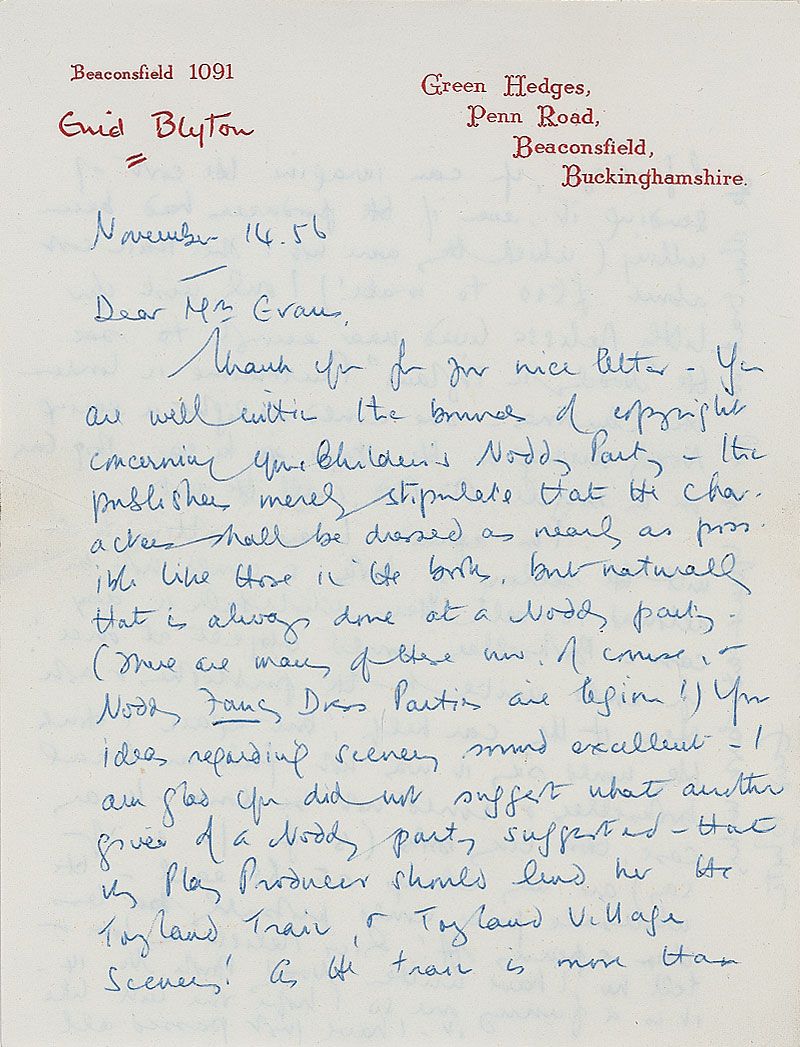 English children's writer also known as Mary Pollock (1897–1968). ALS signed vertically in the left border, “Enid Blyton,” one page both sides, 5.25 x 7, personal letterhead, November 14, 1956. Letter to Doreen Evans. In part: “You are well within the bounds of copyright concerning your children’s Noddy Party—the publishers merely stipulate that the characters shall be dressed as nearly as possible like those in the books, but naturally that is always done at a Noddy Party.” In fine condition, with a few light creases. Accompanied by the original mailing envelope, filled out in Blyton’s hand.