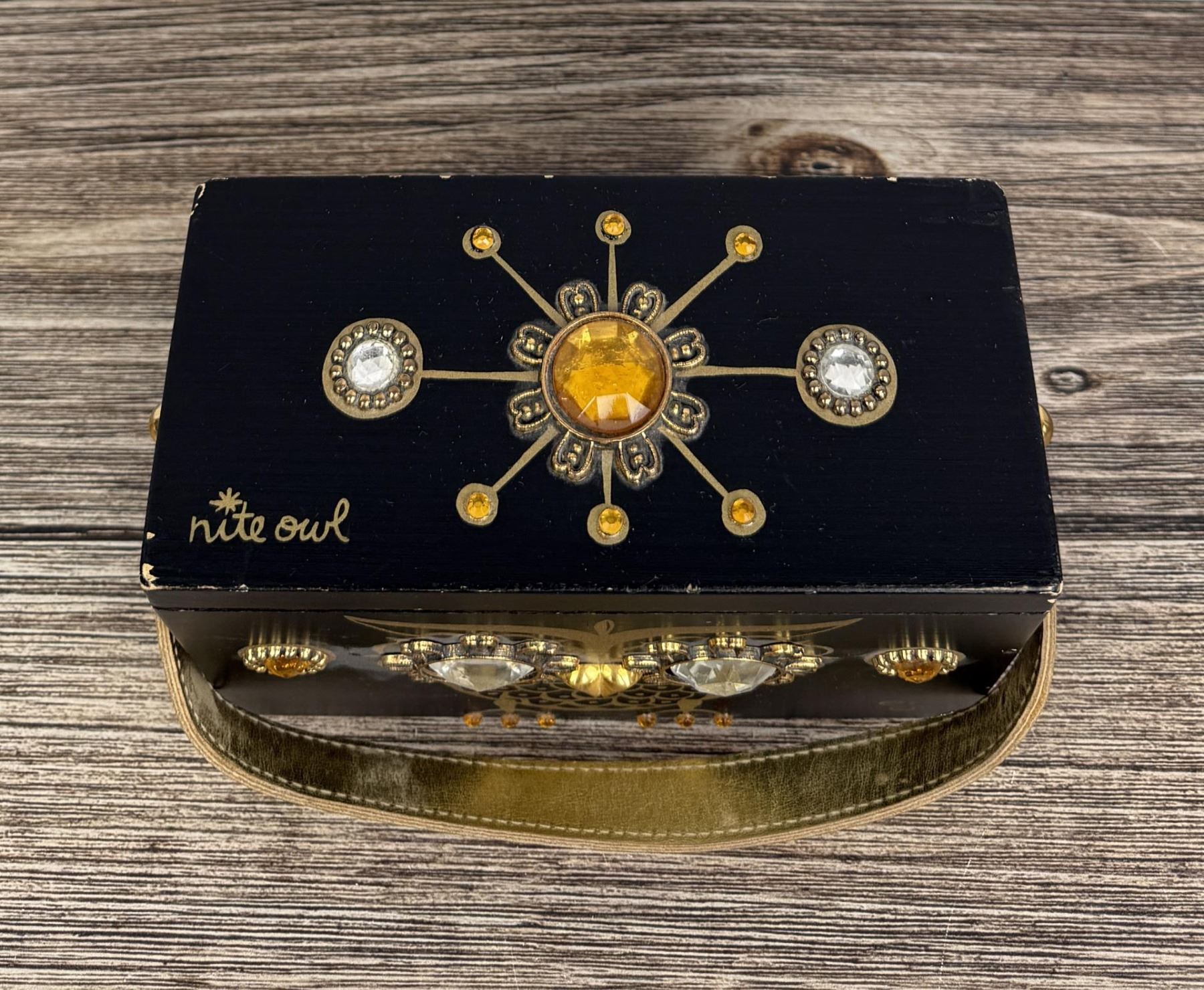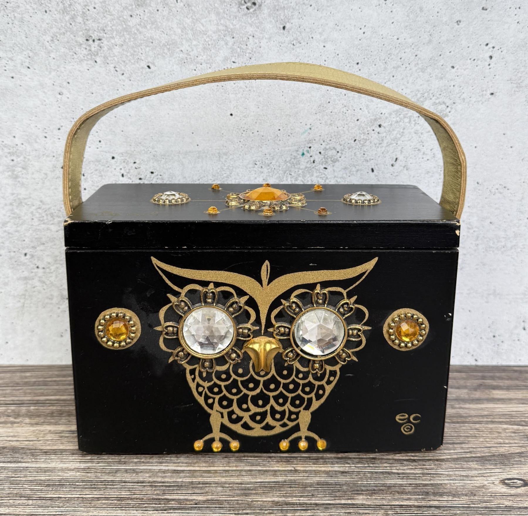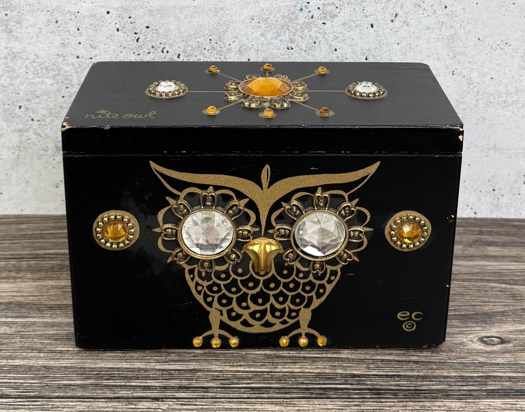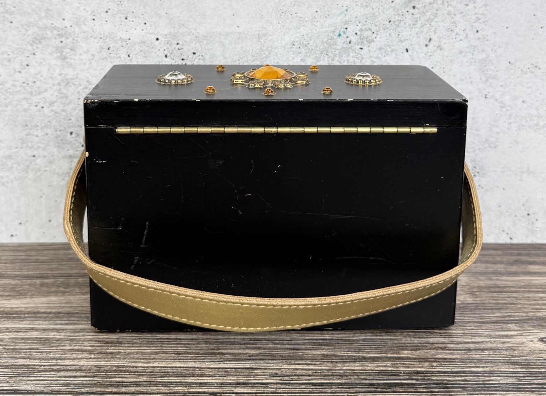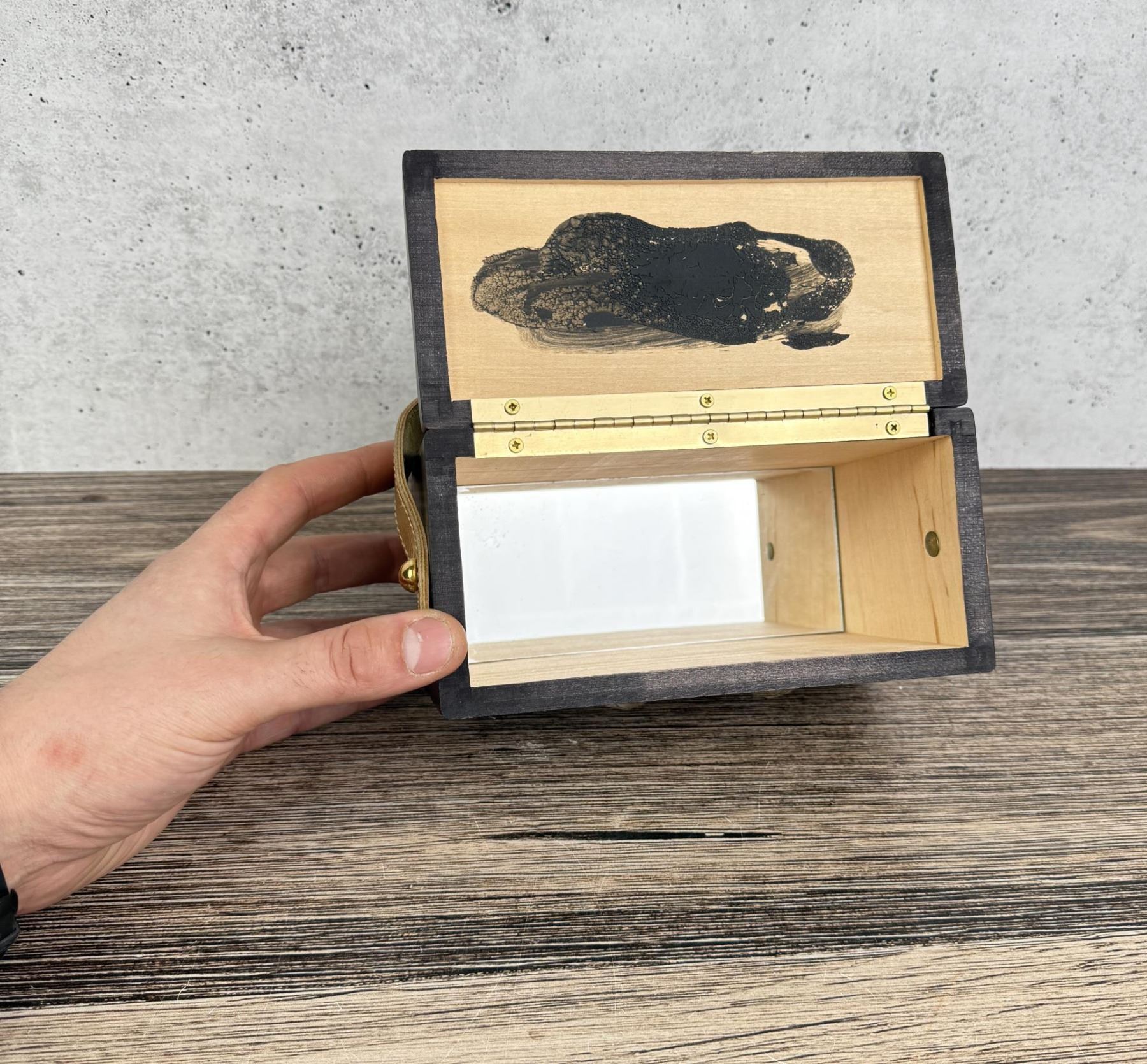 Original mirror inside needs to be glued. 8" by 5" by 4 3/4".