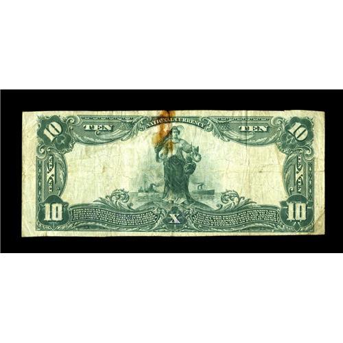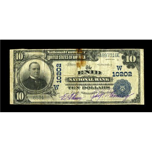 <B>Enid, OK</B></I> - $10 1902 Plain Back Fr. 628 <B>The Enid NB</B></I> Ch. # (W)10202<BR>A very scarce Enid bank which issued large notes only before bowing out after less than thirteen years in business. Just six pieces comprise the entire census listing, with this specimen one of that number. The note itself grades Fine, with bright purple signatures, but we have downgraded it to <B>Very Good</B></I> to account for the rust stain present at the top.<BR><BR><b>Shipping:</b> Coin/Currency (<a target="_blank" href="http://www.heritageauctions.com/common/shipping.php">view shipping information</a>)