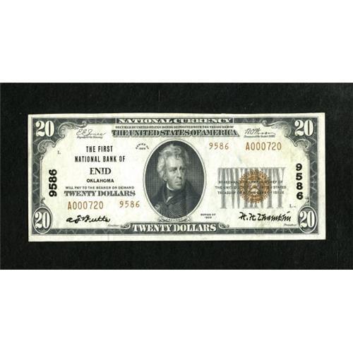 <B>Enid, OK</B></I> - $20 1929 Ty. 2 <B>The First NB</B></I> Ch. # 9586<BR> A <B>Very Fine-Extremely Fine</B></I> example that delivers great eye appeal and is quite crisp and fresh.<BR><I>From The Rolling Plains Collection</B></I><BR><BR><b>Shipping:</b> Coins & Currency (<a target="_blank" href="http://www.heritageauctions.com/common/shipping.php">view shipping information</a>)