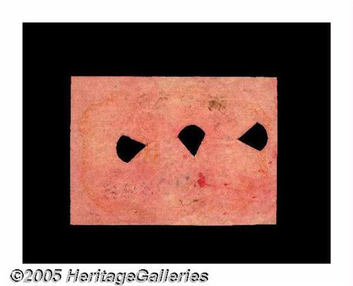 <B> Enigmatic Dry-Printed Negative Essay.</B></I> Extremely light inking remains of a 5¢ negative Essay back printing, although the embossing remains rather pronounced. There are also slight remnants of a blue "SPECIMEN" stamp and three pie-wedge-shaped cancels. The note is dyed light pink, very likely by J.N.T. Levick, which makes the extraordinarily light brown printing even more difficult to see. This piece, which has no Milton number, may not have a whole lot of monetary value, but at the very least, it is extremely interesting and minus its dumb Easter egg color it is an important developmental item.