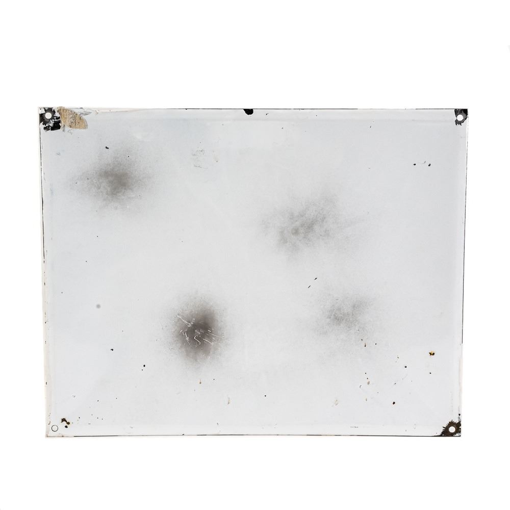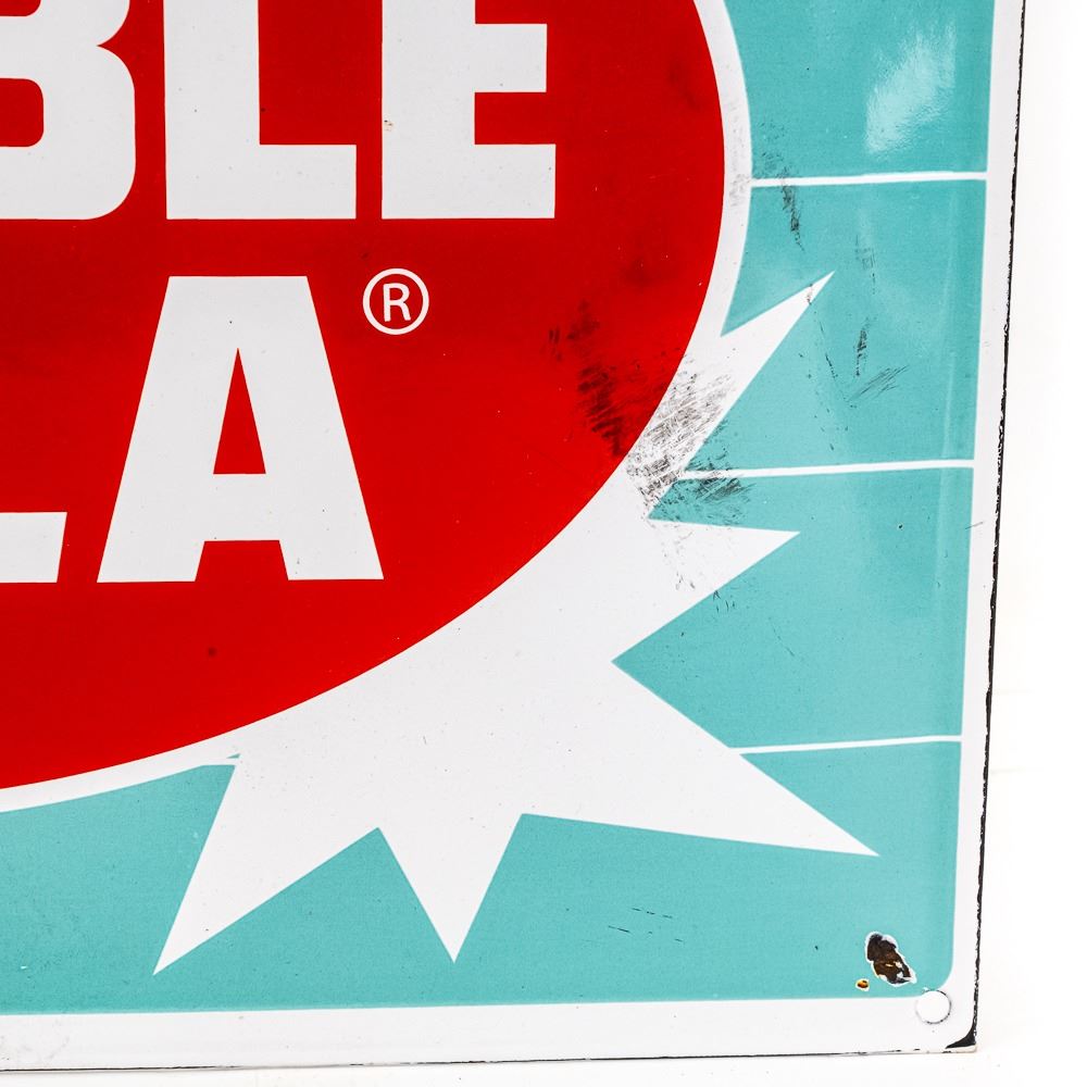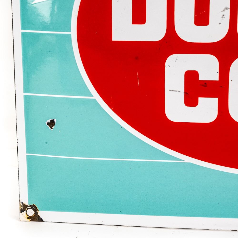 "Enjoy Double Cola" single sided porcelain advertising sign. Presents well with strong color and gloss; in very good overall condition with some discoloration, stray marks, and bolt wear. Approximately 13"t x 16.5"w. Please use photos to judge condition and bid accordingly.
