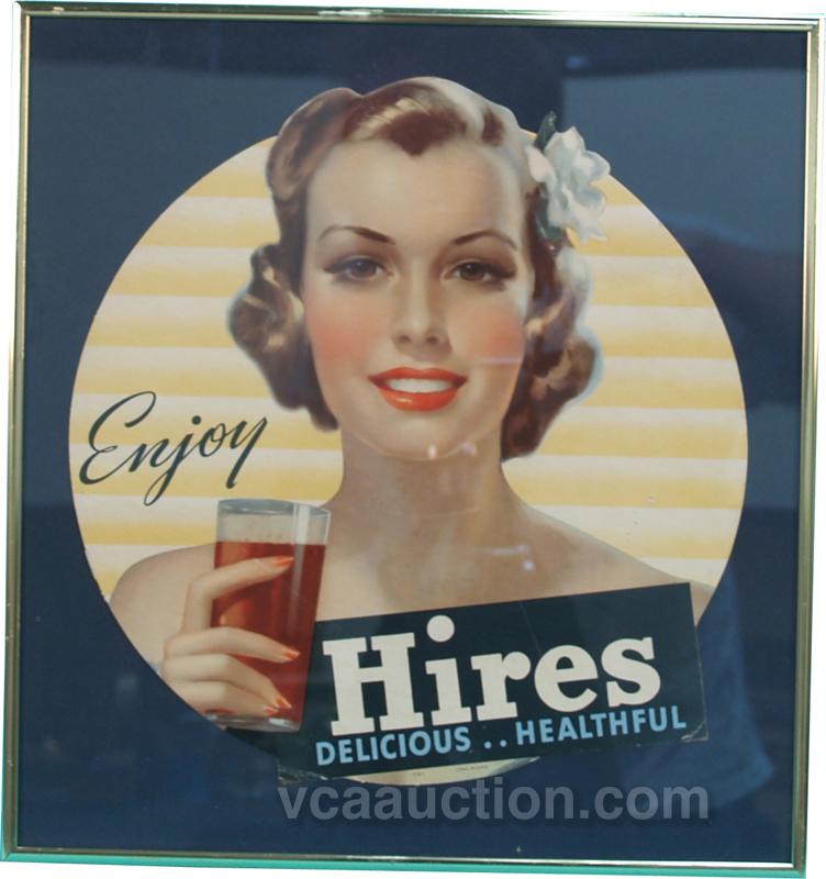 Enjoy Hires Die-Cut Cardboard Sign, "Hires Delicious..Healthful", in frame, ad - 12" diam