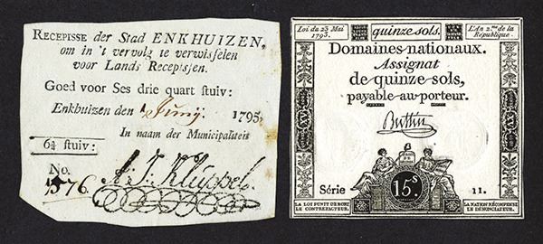 Netherlands, Batavian Republic. 6-3/4 Stuiver. SCWPM B40. Typeset. Uneven borders as often seen, light paper tone at right. Bold embossing, nice paper. Also included is a French Assignat of 15 Sols, 23.5.1973 SCWPM A69. Extremely Fine or better. 2 pieces. Listed as rare and unpriced in SCWPM.