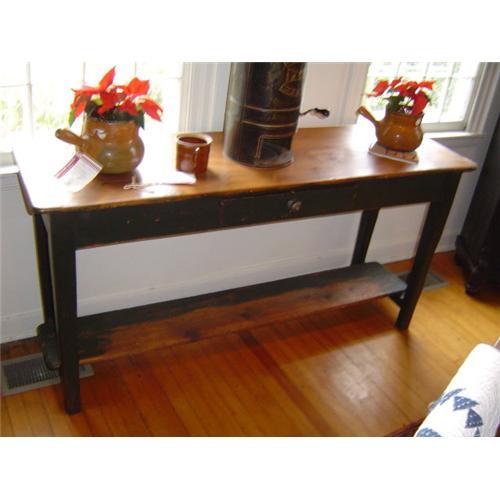 This English sideboard has a stunning top, waxed in pine and new paint. It is forest green with distressed tones of barn red underneath . The potboard shelf, is wonderful for display.