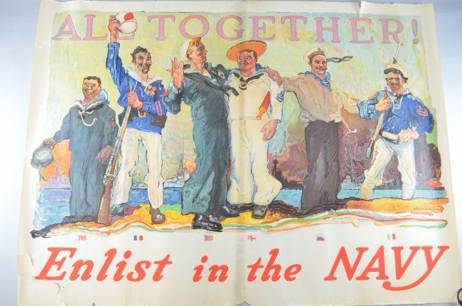 Enlist In The Navy World War I poster, 'All Together!', artwork by H. Reuterdahl, rolled 31? x 43in. (79 x 109cm)