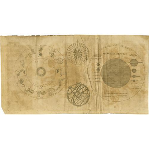 <B>Enoch Gridley- Late 18th Century Chart of the Solar System,</B></I> 15.5" x 8.25", likely English, no publisher's information. An attractive, well composed engraving with an astrological chart on the left and a view of the sun in relation to the planets on the right. Light browning to the extremities, smoothed vertical folds, and old type transfer. Gridley was a noted Americana engraver working first in New York and later in Philadelphia. Fine condition.<BR><BR><b>Shipping:</b> Flatware (<a target="_blank" href="http://www.heritageauctions.com/common/shipping.php">view shipping information</a>)