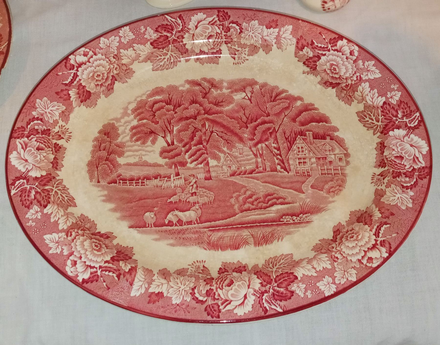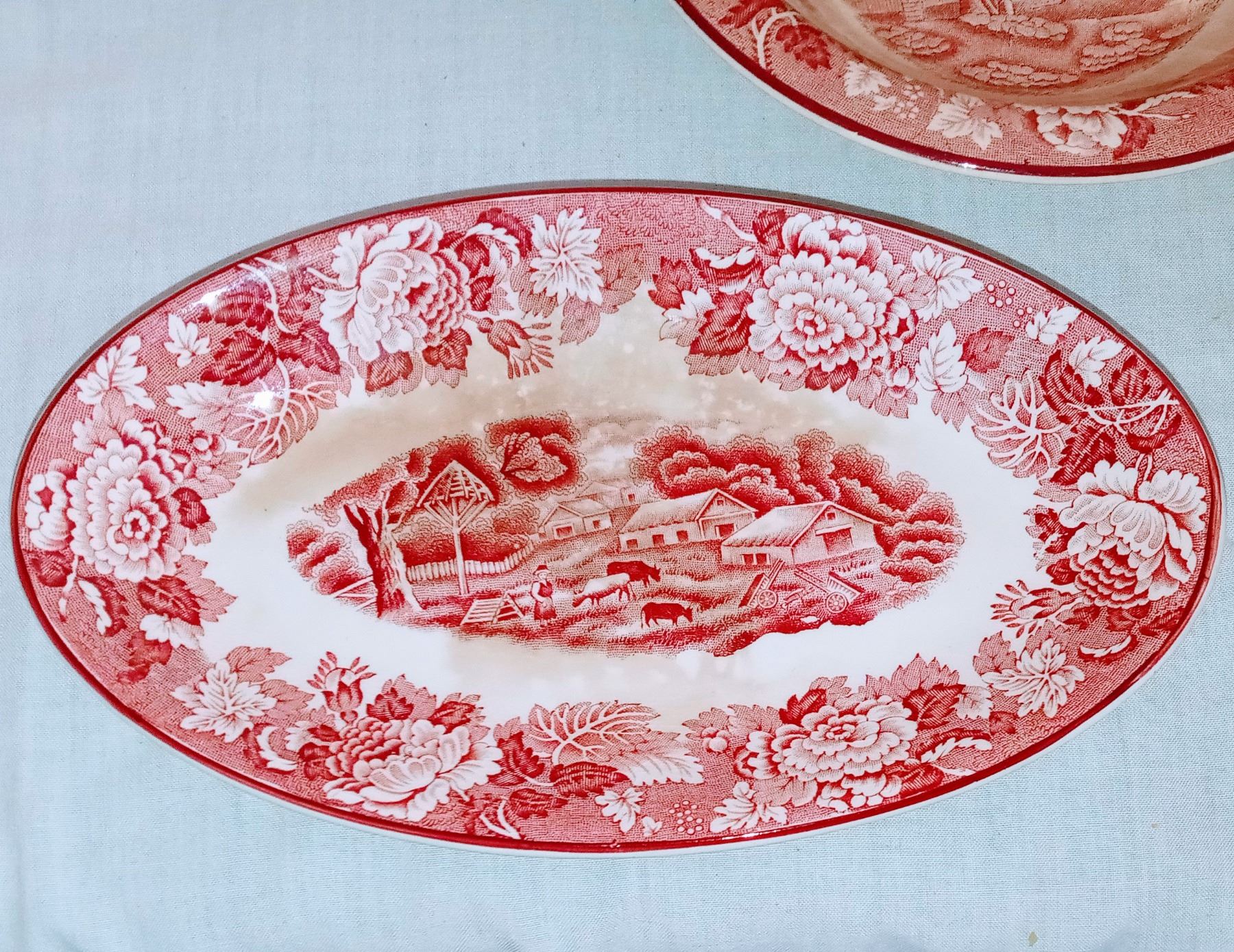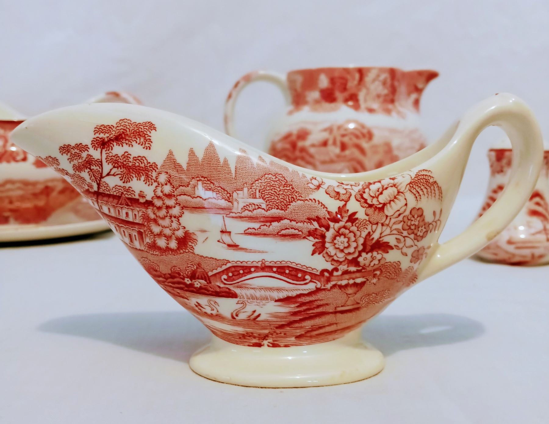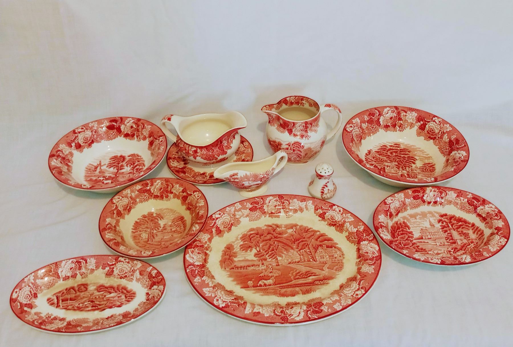 Antique Enoch Woods English Scenery in Pink with the 1917 Mark on Bottom Side. The Set Includes A Serving Platter, 4 Serving Bowls Different Sizes, Pitcher, Gravy Bowl with an Attached Saucer, an Indotogel Gravy Bowl and a Small Oval Serving Dish.