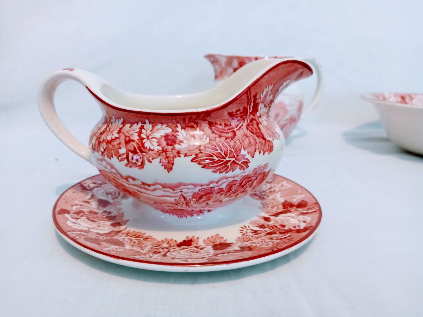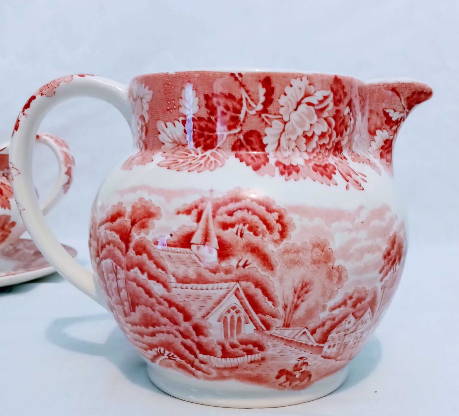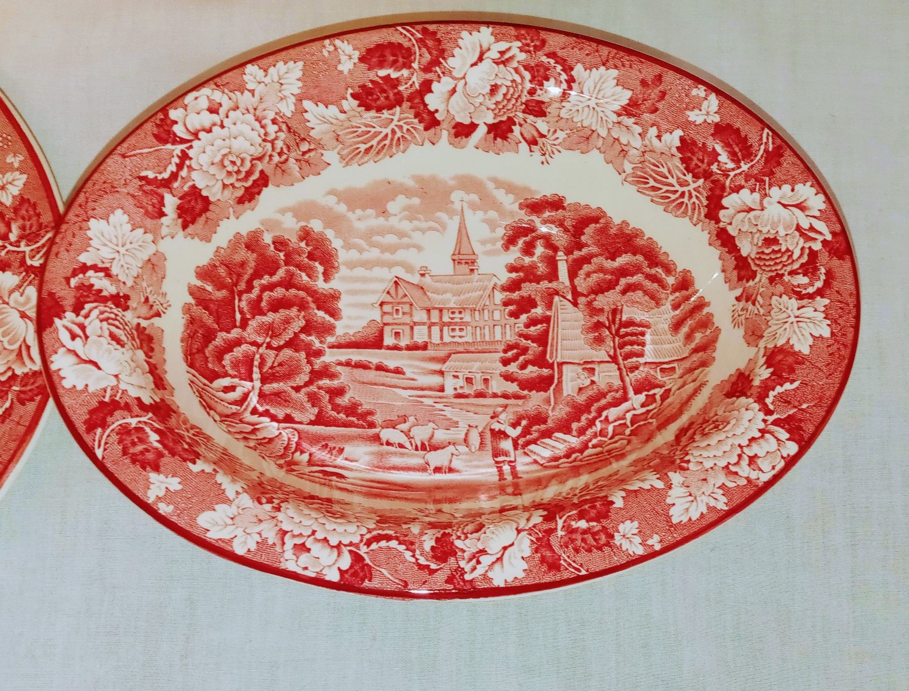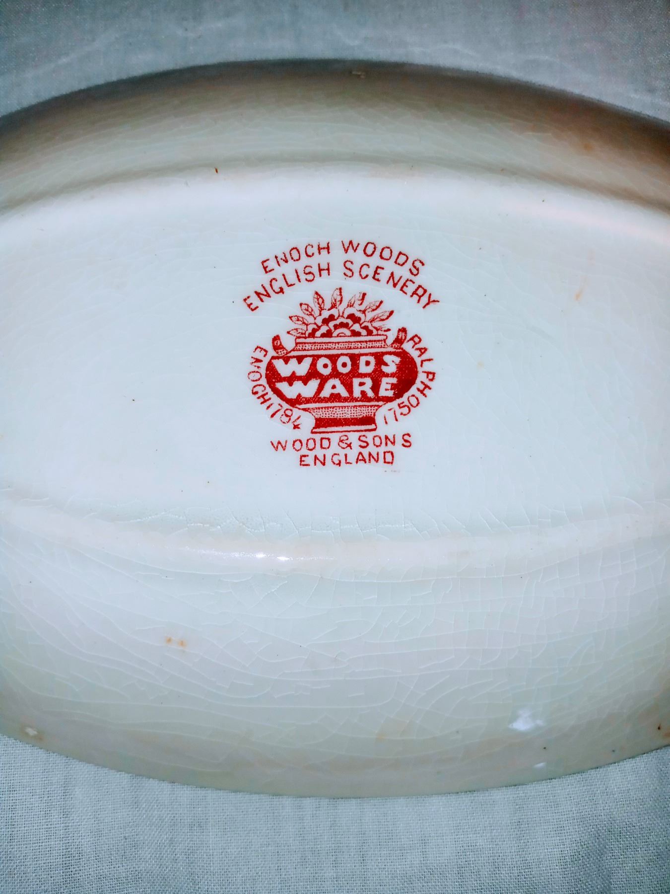 Antique Enoch Woods English Scenery in Pink with the 1917 Mark on Bottom Side. The Set Includes A Serving Platter, 4 Serving Bowls Different Sizes, Pitcher, Gravy Bowl with an Attached Saucer, an Indotogel Gravy Bowl and a Small Oval Serving Dish.