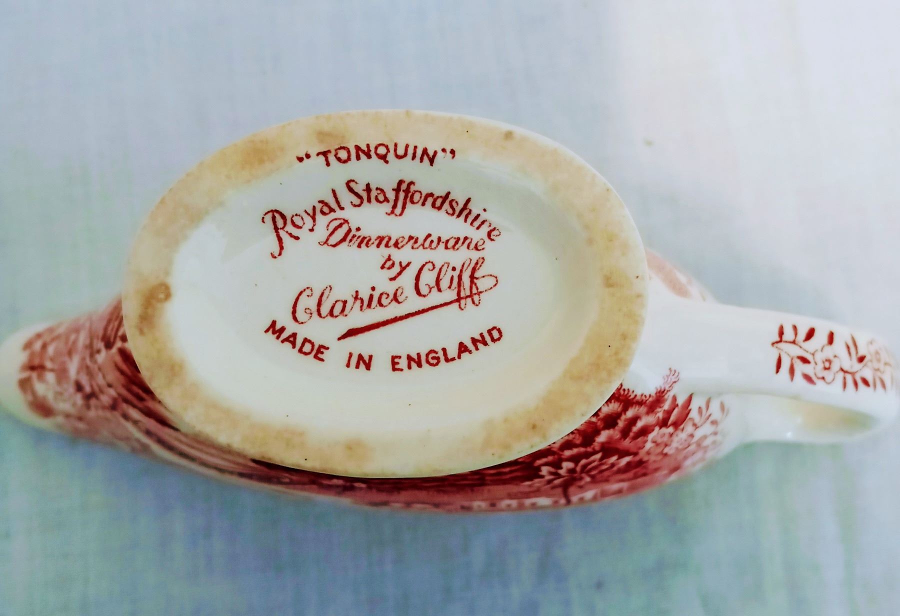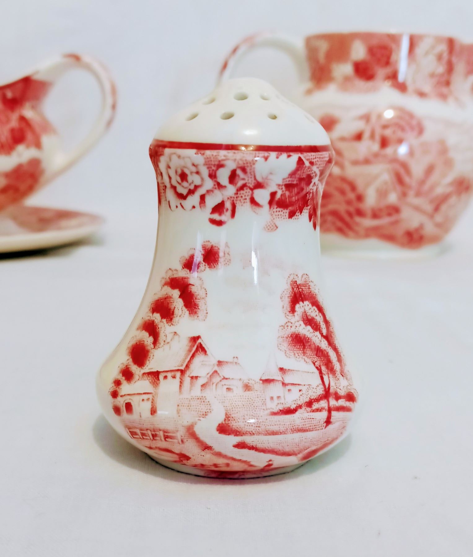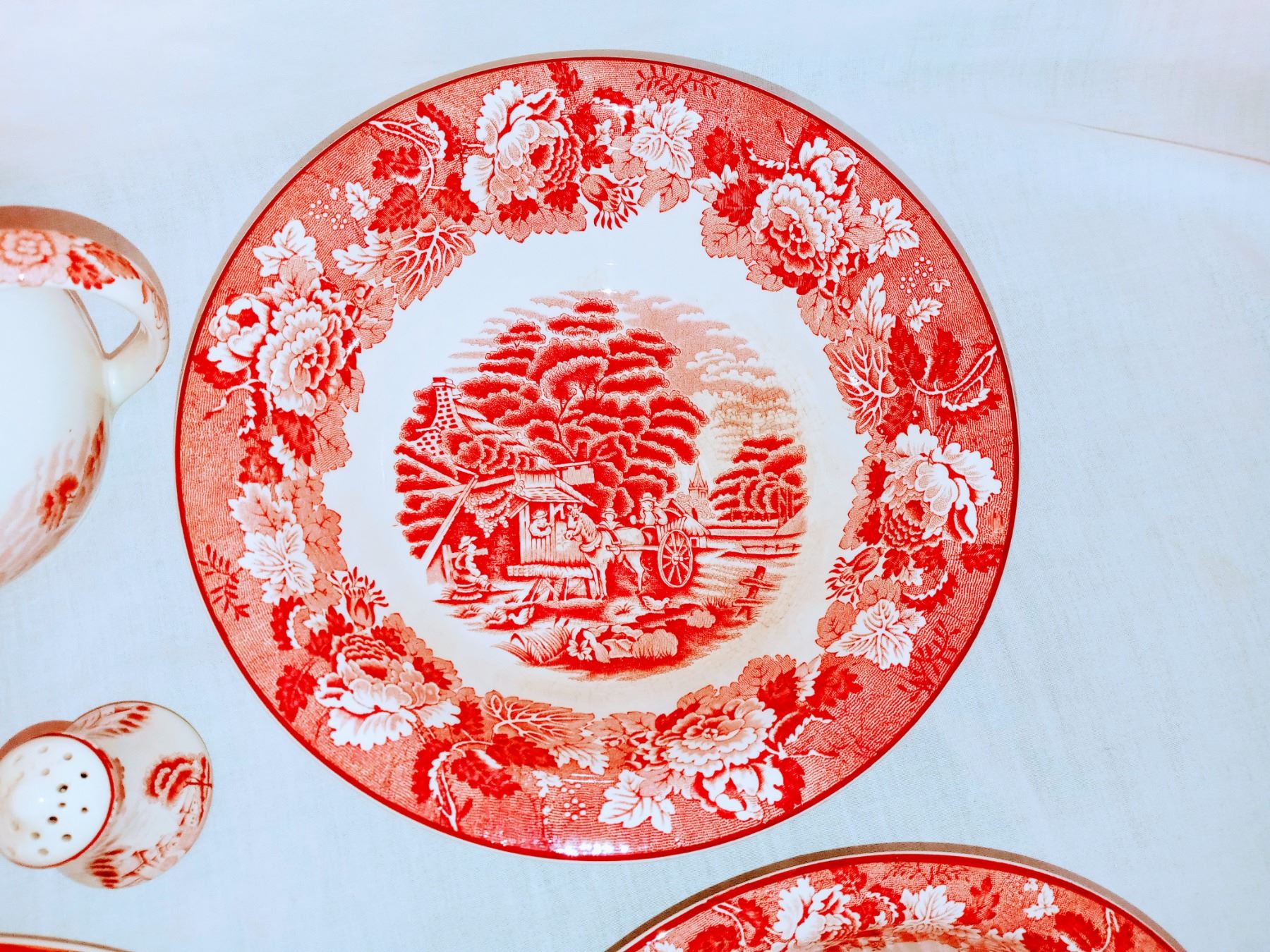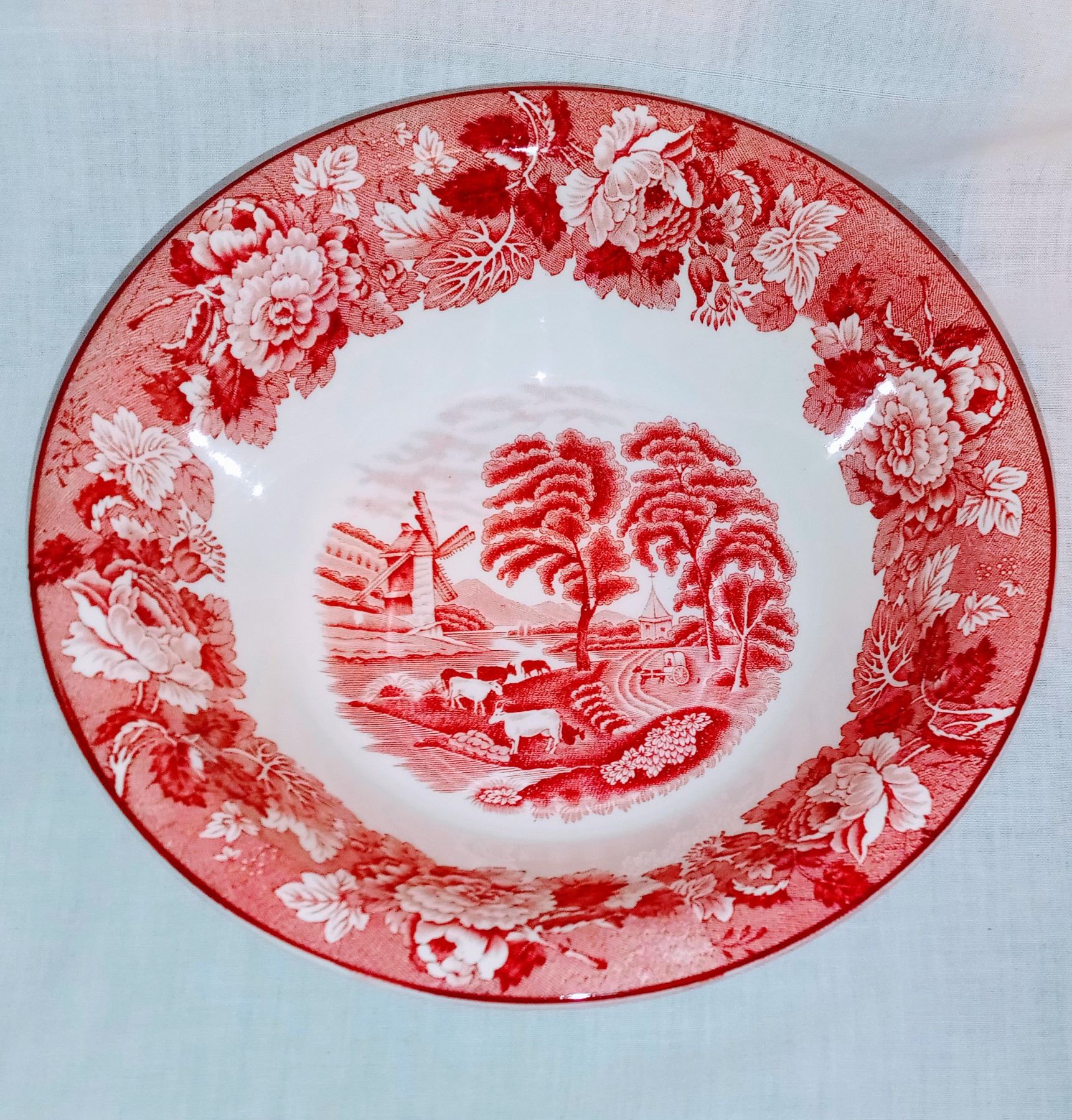 Antique Enoch Woods English Scenery in Pink with the 1917 Mark on Bottom Side. The Set Includes A Serving Platter, 4 Serving Bowls Different Sizes, Pitcher, Gravy Bowl with an Attached Saucer, an Indotogel Gravy Bowl and a Small Oval Serving Dish.