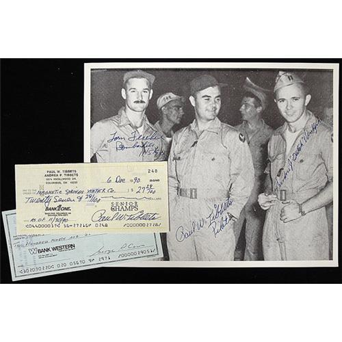 <Our item number 139829><B>"Enola Gay" Autographed.</B> An interesting lot that included a black and white reprint photo (10x8") signed by <B>Paul Tibbetts, Dutch van Kirk</B> and <B>Tom Ferebee</B>. ALSO included are two personal checks signed individually by <B>Paul Tibbetts</B>,and <B>George Caron</B>. An unusual lot in excellent condition. <BR>Estimated Value $250 - 350. <BR><BR>Our item number 139829<BR><IMAGES><P ALIGN="CENTER"><IMG SRC="http://www.goldbergcoins.net/liveauction/49jpegs/139829.jpg"> </P></IMAGES>