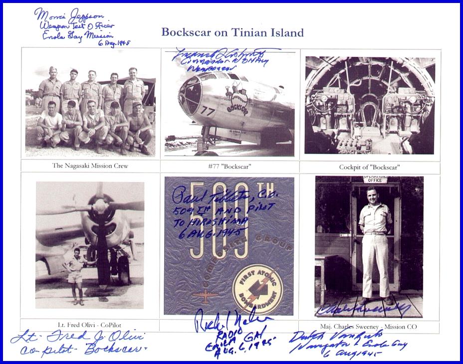 Signed 10'' x 8'' photographic collection of images from the 509th Airborne Composite, ''The First Atomic Bombardment.'' Featuring photos of the group's patch, and the Bocks Car and Enola Gay crews. Signed by seven of the men involved with the missions over Nagasaki and Hiroshima: Paul Tibbets, Charles Sweeney, ''Dutch'' VanKirk, Morris Jeppson, Fred Olivi, Richard Nelson, and Frederick Ashworth.