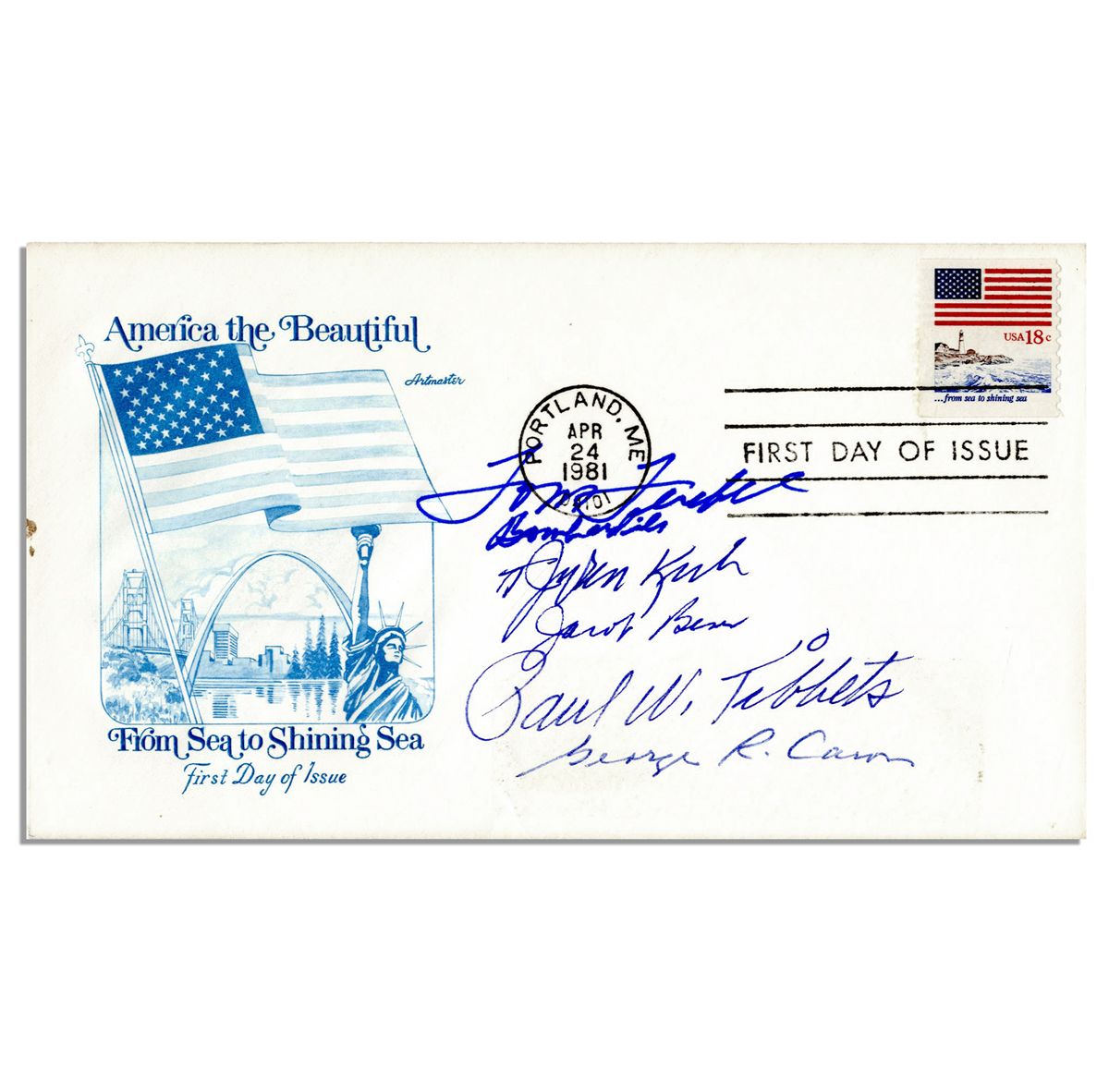 Enola Gay crew signed cover. Commemorative cover featuring ''From Sea to Shining Sea'' theme is signed by Paul Tibbets, Dutch Van Kirk, Tom Ferebee, Jacob Beser and Dick Nelson. Postmarked 1981, envelope is in very good condition.