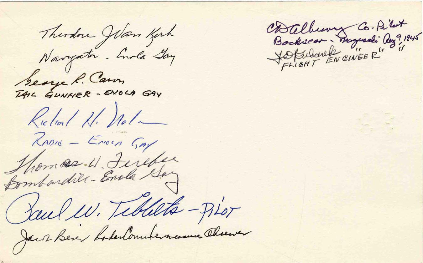 Card signed by six members of the Enola Gay crew including Paul Tibbets, Jacob Beser, Tom Ferebee, Richard Nelson, George Caron and Ted Van Kirk. Each crew member signs their name and position. Additionally signed by two members of the Bock's Car crew. Card measures 5'' x 7''. Jacob Beser signature very rare. Excellent condition.