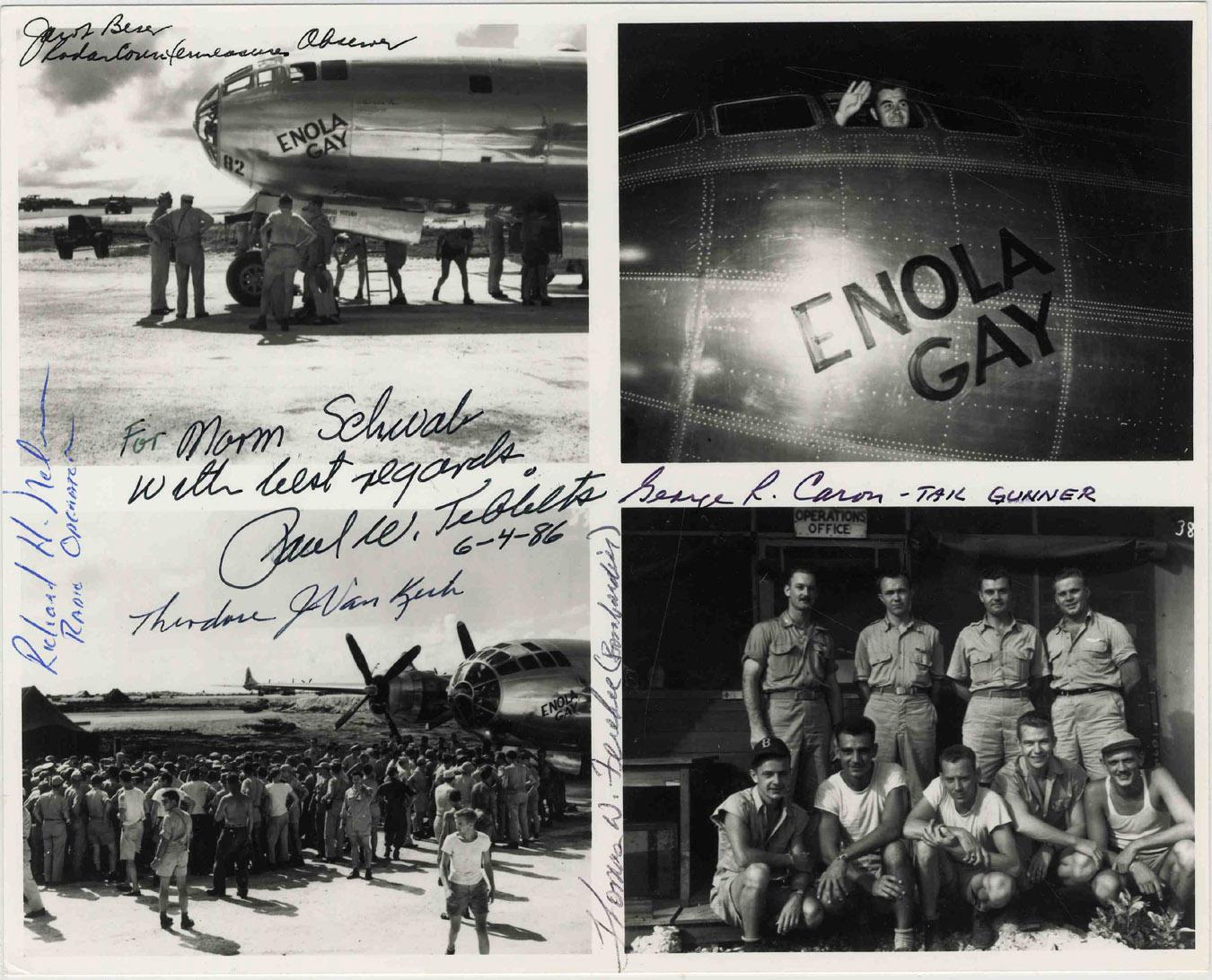 Enola Gay crew signed 10'' x 8'' composite photo. Signed by six members of the Enola Gay crew including very rare Jacob Beser signature. Inscribed in black ink, ''For Norm Schwab / With best regards,'' and signed by Paul Tibbets, George Caron, Jacob Beser, Richard Nelson, Tom Ferebee and Theodore Van Kirk. Dated 4 June 1986 by Paul Tibbets. Excellent condition.
