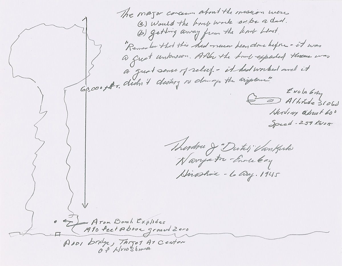 Remarkable original signed pencil sketch on an off-white 11 x 8.5 sheet. Van Kirk draws a large mushroom cloud with a caption "Mushroom cloud, about 60,000 ft. above the target of Aioi Bridge - Center of Hiroshima…The major concerns about the mission were a) Would the bomb work or be a dud b) getting away from the bomb blast. Remember that this had never been done before—it was a great unknown. After the bomb exploded there was a great sense of relief—it had worked and it didn't destroy or damage the airplane." He also draws the Enola Gay airplane's position at the time of the explosion and adds in his hand "Enola Gay Altitude 31,060, heading about 60° speed 259 knots." He also adds at the center of the explosion " Atomic Bomb Explosion 1980 ft. above ground zero." Signed in pencil "Theodore J. Van Kirk - Navigator - Enola Gay - 6 Aug 1945.” In fine condition. An important, and possibly one-of-a-kind, first hand account of the first ever use of a nuclear weapon during war time.