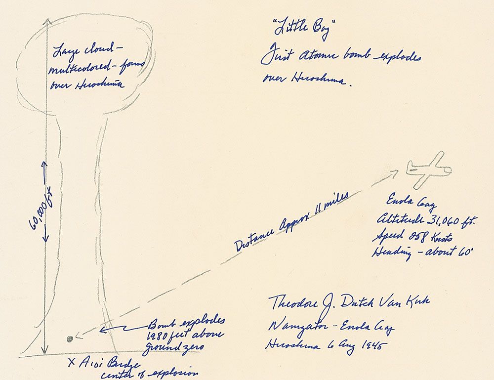 Original signed pencil and ink sketch on an off-white 11 x 8.5 sheet. Van Kirk draws a large mushroom cloud with a caption “Large cloud—multicolored—forms over Hiroshima,” noting at the bottom, “Bomb explodes 1980 feet above ground zero. Aioi Bridge center of explosion.” He also draws the Enola Gay airplane's position at the time of the explosion and adds in his hand "Enola Gay Altitude 31,060 ft., speed 258 knots, heading about 60°." Signed at the bottom, “Theodore J. Dutch Van Kirk, Navigator, Enola Gay, Hiroshima 6 Aug 1945.” In fine condition.