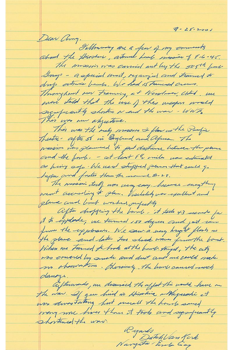 ALS, one page, lightly-lined, 8.5 x 13.25, September 25, 2001. Letter describing his experience while dropping the atomic bomb. In part: “The mission was carried out by the 509th bomb group—a special unit, organized and trained to drop the atomic bombs…we were told that the use of this weapon would significantly shorten or end the war—WWII. This was our objective…The mission itself was very easy because everything went according to plan…After dropping the bomb it took +3 seconds for it to explode…We saw a very bright flash in the plane and later two shock waves from the bomb.” In fine condition.