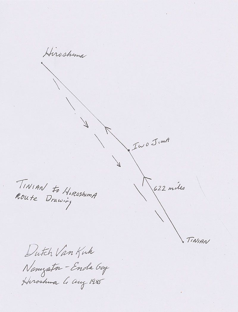 Original signed ballpoint sketch of the Enola Gay’s flight route from Tinian to Hiroshima and back on a white 8.5 x 11 sheet, signed at the bottom, “Dutch Van Kirk, Navigator—Enola Gay, Hiroshima, 6 Aug 1945.” In very fine condition.