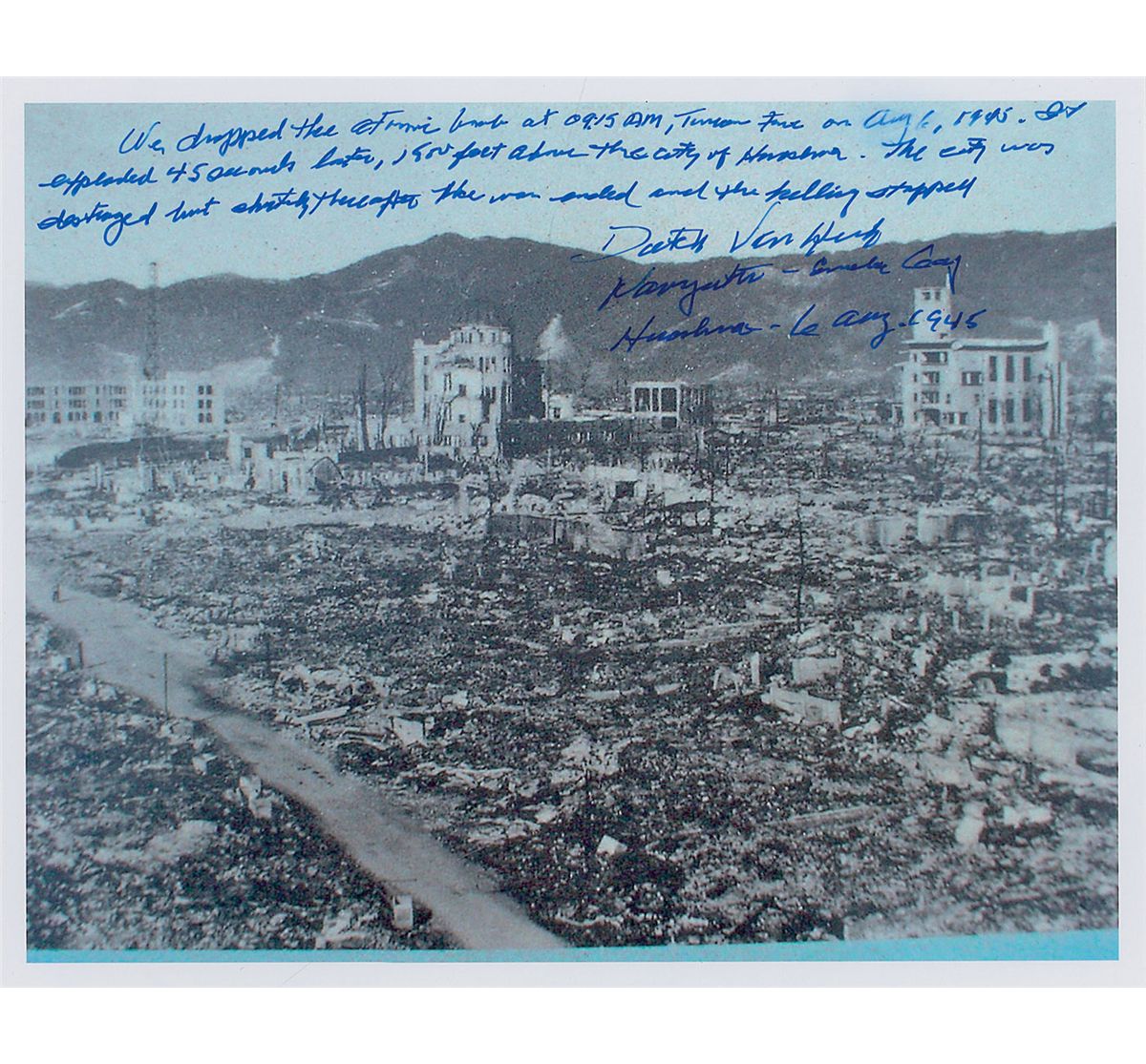 Glossy 10 x 8 photo of the devastation at Hiroshima, lengthily signed in blue felt tip, “We dropped the atomic bomb at 09:15 AM, Tinian time on Aug 6, 1945. It exploded 45 seconds later, 1900 feet above the city of Hiroshima. The city was destroyed but shortly thereafter the war ended and the killing stopped. Dutch Van Kirk, Navigator—Enola Gay, Hiroshima—6 Aug 1945.” In fine condition, with a slight brush to ink in one word and a JSA label affixed to the reverse. Accompanied by a certificate of authenticity from JSA.