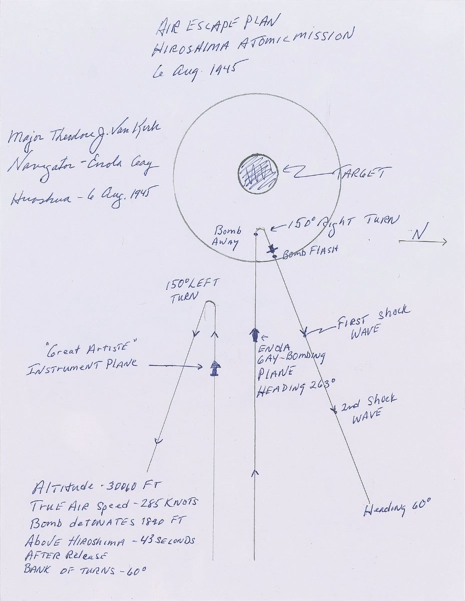 Detailed original signed ballpoint and pencil diagram sketch of the Enola Gay’s air escape plan on a white 8.5 x 11 sheet, signed in the upper left, “Major Theodore J. Van Kirk, Navigator—Enola Gay, Hiroshima—6 Aug. 1945.” Van Kirk has circled the target and drop zone, plotted the return courses for both the Enola Gay and the Great Artiste, and marked where the planes would experience the first and second shock waves of the blast. In the lower left corner he adds, “Altitude-30060 FT, True Air Speed–285 knots, Bomb detonates 1890 FT above Hiroshima—43 seconds after release, Bank of turns—60°.” In fine condition.