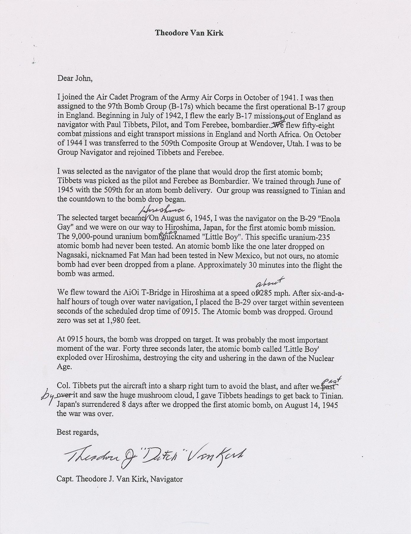 TLS signed “Theodore J. 'Dutch' Van Kirk,” one page, 8.5 x 11, personal letterhead, no date. In part: "I was selected as the navigator of the plane that would drop the first atomic bomb; Tibbets was picked as the pilot and Ferebee as Bombardier. We trained through June of 1945 with the 509th for an atom bomb delivery. Our group was reassigned to Tinian and the countdown to the bomb drop began. The selected target became Hiroshima. On August 6, 1945, I was the navigator on the B-29 'Enola Gay' and we were on our way to Hiroshima, Japan, for the atomic bomb mission. The 9,000–pound uranium bomb was nicknamed 'Little boy.' This specific uranium–235 atomic bomb had never been tested. An atomic bomb like the one later dropped on Nagasaki, nicknamed Fat Man had been tested in New Mexico, but not ours, no atomic bomb had ever been dropped from a plane. Approximately 30 minutes into the flight the bomb was armed. We flew toward the AiOi T-Bridge in Hiroshima at a speed of about 285 mph. After six-and-a-half hours of tough over water navigation, I placed the B-29 over target within seventeen seconds of the scheduled drop time of 0915. The Atomic bomb was dropped. Ground zero was set at 1,980 feet…It was probably the most important moment of the war. Forty three seconds later, the atomic bomb called 'Little Boy' exploded over Hiroshima, destroying the city and ushering in the dawn of the Nuclear Age." Van Kirk makes several emendations to the text in his own hand. In fine condition.