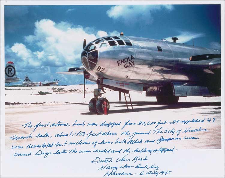 Color satin-finish 10 x 8 photo of the Enola Gay on the runway, signed in blue felt tip “The first atomic bomb was dropped from an altitude of 30,600 ft. It exploded 43 seconds later about 1800 ft above the ground. The city of Hiroshima was devastated, but millions of lives both Allied and Japanese were saved. Days later the war ended and the killing stopped. Dutch Van Kirk, Navigator—Enola Gay, Hiroshima—6 Aug. 1945.” In very fine condition. Pre-certified PSA/DNA and RRAuction COA.