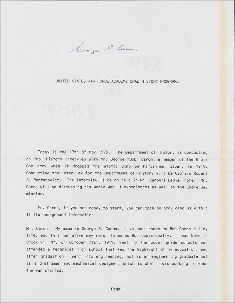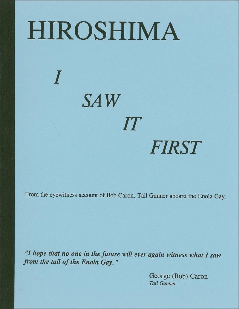 Limited edition souvenir typescript entitled, ‘Hiroshima, I Saw It First, from the eyewitness account of Enola Gay tail gunner, George (Bob) Caron,’ thirty-nine pages, copyright 1993, #87/150. Signed on the third page in blue ink, “George A. Caron.” In fine condition.