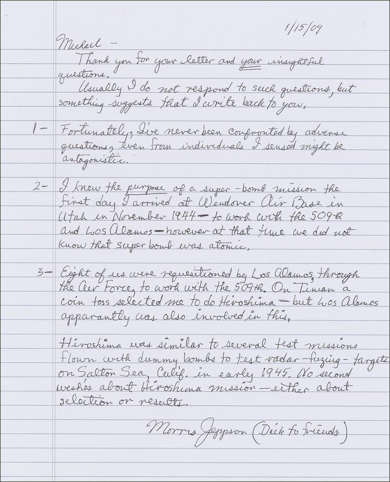 ALS signed “Morris Jeppson (Dick to friends),” one page, lightly-lined, 8.5 x 11, January 15, 2009. Letter regarding questions of the Enola Gay mission. In part: “I’ve never been confronted by adverse questions, even from individuals I sensed might be antagonistic…Eight of us were requisitioned by Los Alamos…to work with the 509th. On Tinian, a coin toss selected me to do Hiroshima…Hiroshima was similar to several test missions flown with dummy bombs to test radar-fuzing-targets on Salton Sea, Calif., in early 1945. No second wishes about Hiroshima mission–either about selection or results.” In fine condition. A rare and insightful look into Jeppson’s thoughts and role as a crew member, as for years he refused to discuss any aspect of his mission.