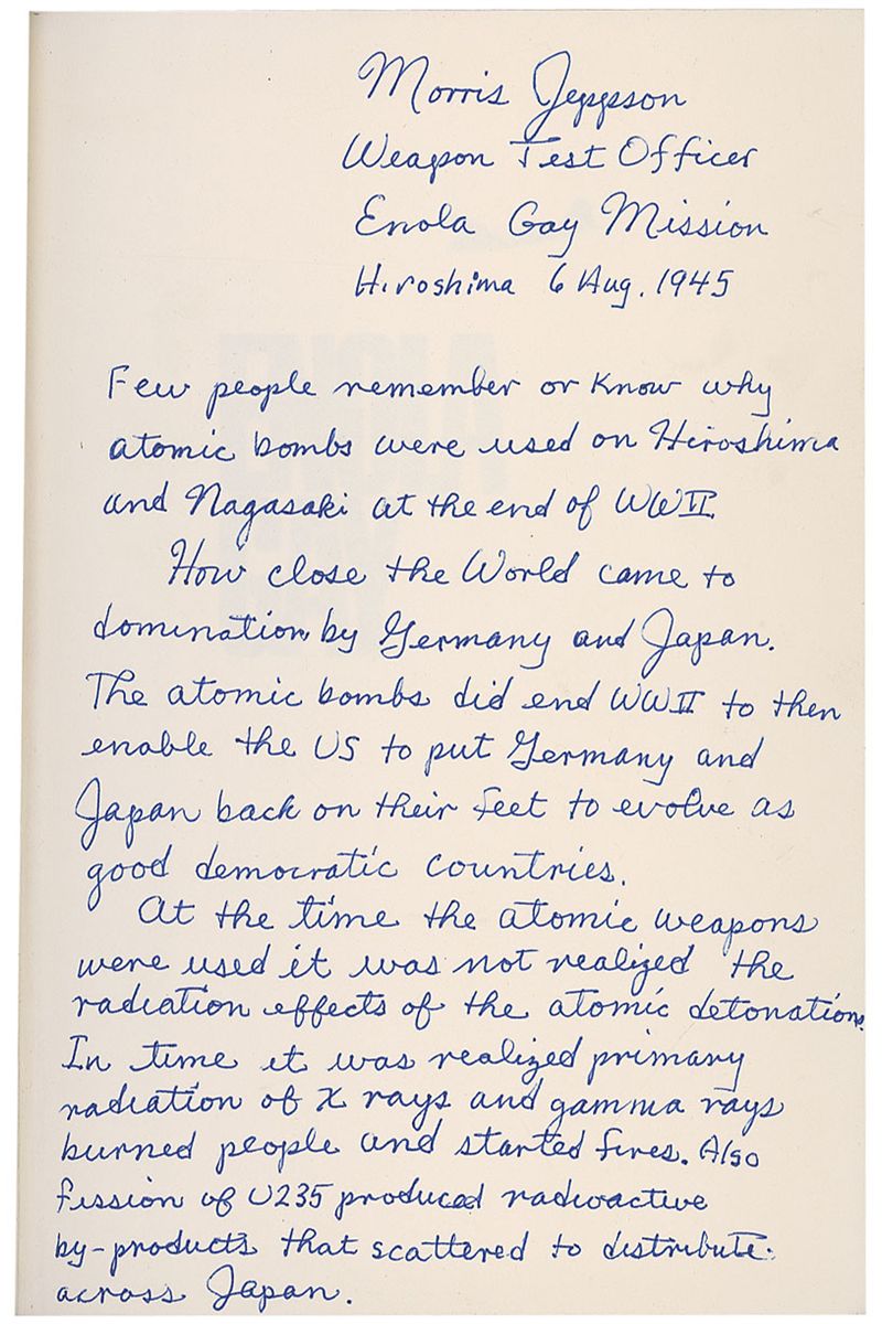 Signed book: Enola Gay. Later printing. NY: Stein and Day, 1977. Hardcover with dustjacket, 6.25 x 9.25, 327 pages. Signed on the first free-end page, “Morris Jeppson, Weapon Test Officer, Enola Gay Mission, Hiroshima, 6 Aug 1945.” Under his signature, Jeppson adds a lengthy personal commentary which reads, “Few people remember how or know why atomic bombs were used on Hiroshima and Nagasaki at the end of WWII. How close the World came to domination by Japan and Germany. The atomic bomb did end WWII to then enable the US to put Germany and Japan back on their feet to evolve as good democratic countries. At the time the atomic weapons were used it was not realized the radiation effects of the atomic detonation. In time it was realized primary radiation of x-rays and gamma rays burned people and started fires. Also fission of U235 produced radio by-products that scattered to distribute across Japan.” In fine condition, with some edge wear, creasing, and toning to dustjacket. A rare look into the thoughts of one of the crew members who had a direct hand in ending the second World War.